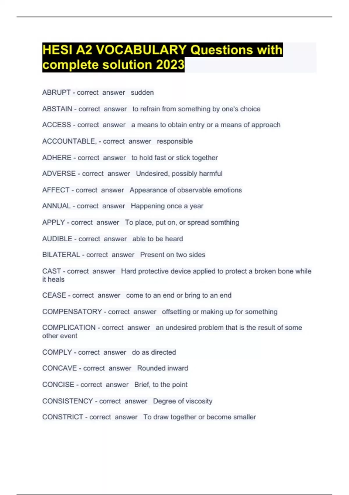 HESI A2 VOCABULARY Questions with complete solution 2023ABRUPT sudden ABSTAIN to refrain from something by one's choice ACCESS a means to obtain entry or a means of approach ACCOUNTABLE, responsible ADHERE to hold fast or stick together ADVERSE Undesired, possibly harmful AFFECT Appearance of observable emotions ANNUAL Happening once a year APPLY To place, put on, or spread somthing AUDIBLE able to be heard BILATERAL Present on two sides CAST Hard protective device applied to protect a broken bone while it heals CEASE come to an end or bring to an end COMPENSATORY offsetting or making up for something COMPLICATION an undesired problem that is the result of some other event