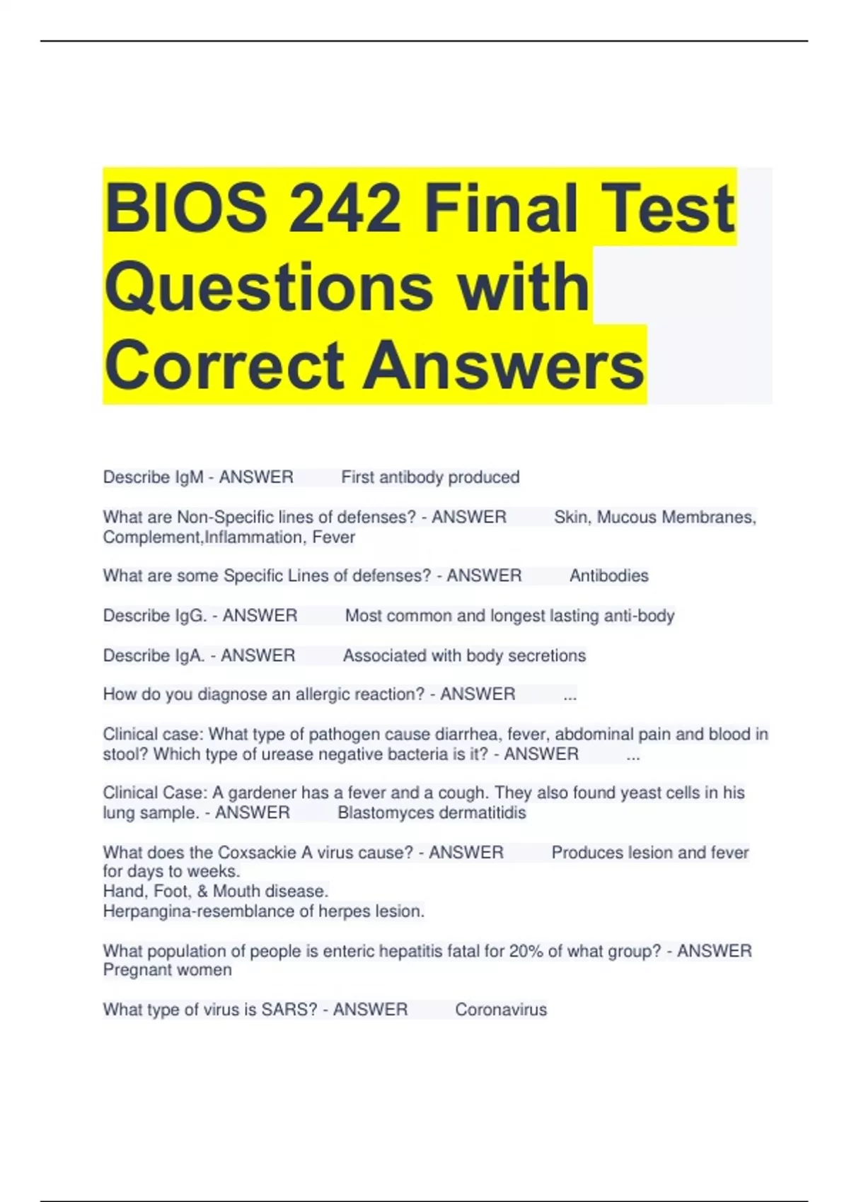 BIOS 242 Final Test Questions with Correct Answers Describe IgM - ANSWER First antibody produced What are Non-Specific lines of defenses? - ANSWER Skin, Mucous Membranes, Complement,Inflammation, Fever What are some Specific Lines of defenses? - ANSWER Antibodies Describe IgG. - ANSWER Most common and longest lasting anti-body Describe IgA. - ANSWER Associated with body secretions How do you diagnose an allergic reaction? - ANSWER ... Clinical case: What type of pathogen cause diarrhea, fever, abdominal pain and blood in stool? Which type of urease negative bacteria is it? - ANSWER ... Clinical Case: A gardener has a fever and a cough. They also found yeast cells in his lung sample. - ANSWER Blastomyces dermatitidis What does the Coxsackie A virus cause? - ANSWER Produces lesion and fever for days to weeks. Hand, Foot, & Mouth disease. Herpangina-resemblance of herpes lesion. What population of people is enteric hepatitis fatal for 20% of what group? - ANSWER Pregnant women What type of virus is SARS? - ANSWER Coronavirus Characteristics of Measels - ANSWER Spread by respiratory droplets. Koplik's spots apppear on mouth. Characteristic of Influenza - ANSWER caused by orthoyxovirus types A and B. occurs through inhalation of airborne viruses.