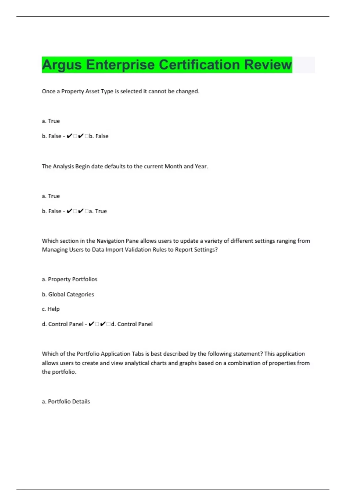 Once a Property Asset Type is selected it cannot be changed. a. True b. False - ️️b. False The Analysis Begin date defaults to the current Month and Year. a. True b. False - ️️a. True Which section in the Navigation Pane allows users to update a variety of different settings ranging from Managing Users to Data Import Validation Rules to Report Settings? a. Property Portfolios b. Global Categories c. Help d. Control Panel - ️️d. Control Panel Which of the Portfolio Application Tabs is best described by the following statement? This application allows users to create and view analytical charts and graphs based on a combination of properties from the portfolio. a. Portfolio Details