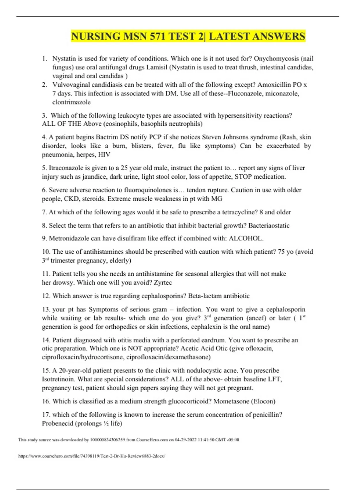 NURSING MSN 571 TEST 2| LATEST ANSWERS 1. Nystatin is used for variety of conditions. Which one is it not used for? Onychomycosis (nail fungus) use oral antifungal drugs Lamisil (Nystatin is used to treat thrush, intestinal candidas, vaginal and oral candidas ) 2. Vulvovaginal candidiasis can be treated with all of the following except? Amoxicillin PO x 7 days. This infection is associated with DM. Use all of these--Fluconazole, miconazole, clontrimazole 3. Which of the following leukocyte types are associated with hypersensitivity reactions? ALL OF THE Above (eosinophils, basophils neutrophils) 4. A patient begins Bactrim DS notify PCP if she notices Steven Johnsons syndrome (Rash, skin disorder, looks like a burn, blisters, fever, flu like symptoms) Can be exacerbated by pneumonia, herpes, HIV