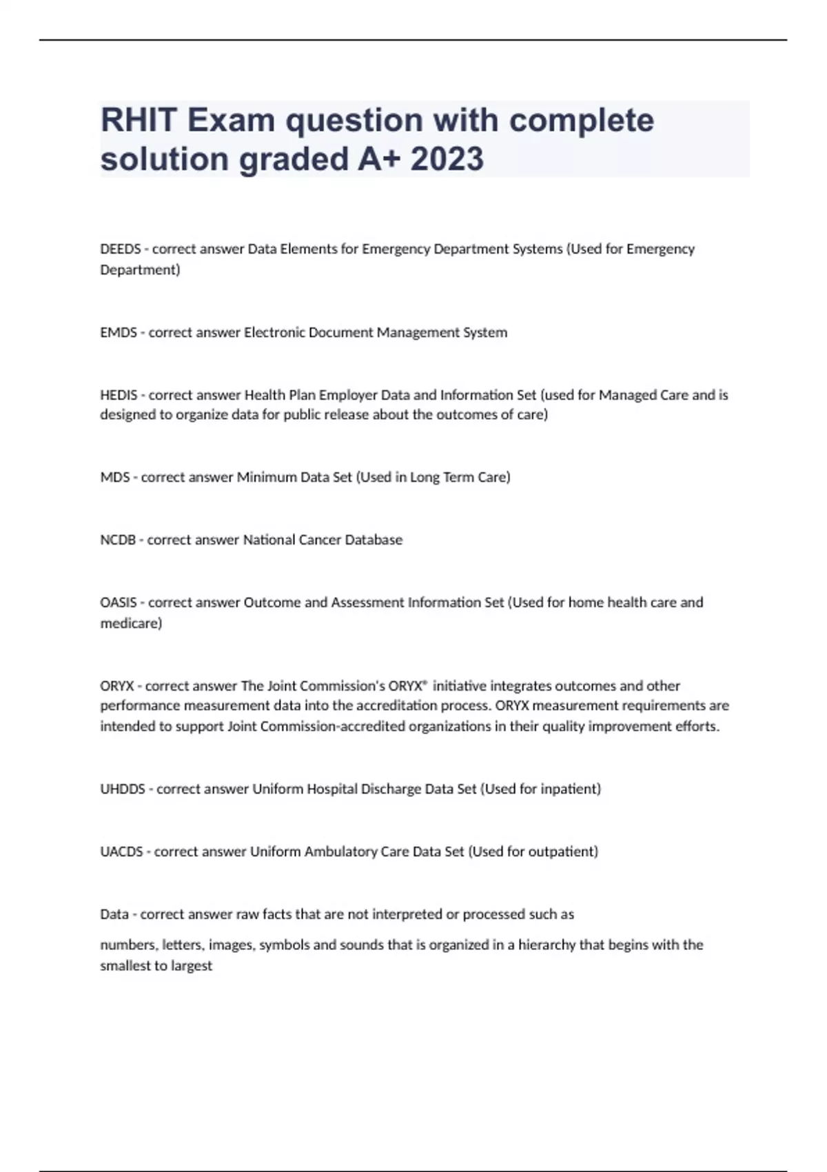 RHIT Exam question with complete solution graded A+ 2023DEEDS - correct answer Data Elements for Emergency Department Systems (Used for Emergency Department) EMDS - correct answer Electronic Document Management System HEDIS - correct answer Health Plan Employer Data and Information Set (used for Managed Care and is designed to organize data for public release about the outcomes of care) MDS - correct answer Minimum Data Set (Used in Long Term Care) NCDB - correct answer National Cancer Database OASIS - correct answer Outcome and Assessment Information Set (Used for home health care and medicare) ORYX - correct answer The Joint Commission's ORYX® initiative integrates outcomes and other performance measurement data into the accreditation process. ORYX measurement requirements are intended to support Joint Commission-accredited organizations in their quality improvement efforts. UHDDS - correct answer Uniform Hospital Discharge Data Set (Used for inpatient) UACDS - correct answer Uniform Ambulatory Care Data Set (Used for outpatient) Data - correct answer raw facts that are not interpreted or processed such as numbers, letters, images, symbols and sounds that is organized in a hierarchy that begins with the smallest to largest