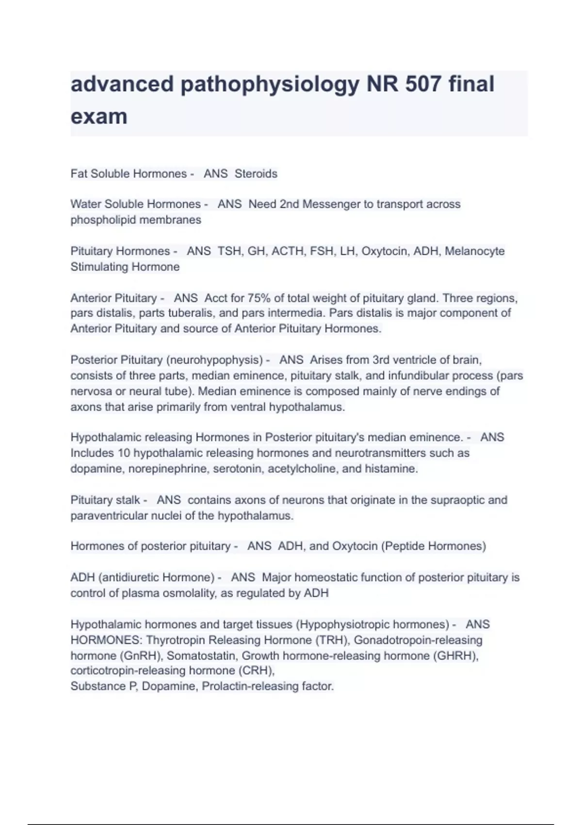 Advanced pathophysiology NR 507 final exam Fat Soluble Hormones - ANS Steroids Water Soluble Hormones - ANS Need 2nd Messenger to transport across phospholipid membranes Pituitary Hormones - ANS TSH, GH, ACTH, FSH, LH, Oxytocin, ADH, Melanocyte Stimulating Hormone Anterior Pituitary - ANS Acct for 75% of total weight of pituitary gland. Three regions, pars distalis, parts tuberalis, and pars intermedia. Pars distalis is major component of Anterior Pituitary and source of Anterior Pituitary Hormones. Posterior Pituitary (neurohypophysis) - ANS Arises from 3rd ventricle of brain, consists of three parts, median eminence, pituitary stalk, and infundibular process (pars nervosa or neural tube). Median eminence is composed mainly of nerve endings of axons that arise primarily from ventral hypothalamus. Hypothalamic releasing Hormones in Posterior pituitary's median eminence. - ANS Includes 10 hypothalamic releasing hormones and neurotransmitters such as dopamine, norepinephrine, serotonin, acetylcholine, and histamine. Pituitary stalk - ANS contains axons of neurons that originate in the supraoptic and paraventricular nuclei of the hypothalamus. Hormones of posterior pituitary - ANS ADH, and Oxytocin (Peptide Hormones) ADH (antidiuretic Hormone) - ANS Major homeostatic function of posterior pituitary is control of plasma osmolality, as regulated by ADH Hypothalamic hormones and target tissues (Hypophysiotropic hormones) - ANS HORMONES: Thyrotropin Releasing Hormone (TRH), Gonadotropoin-releasing hormone (GnRH), Somatostatin, Growth hormone-releasing hormone (GHRH), corticotropin-releasing hormone (CRH), Substance P, Dopamine, Prolactin-releasing factor.