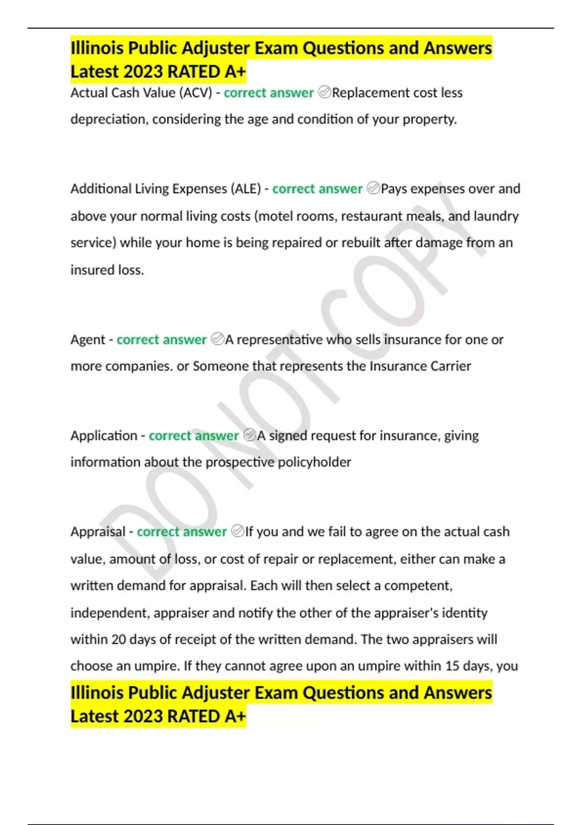 Illinois Public Adjuster Exam Questions and Answers Latest 2023 RATED A+