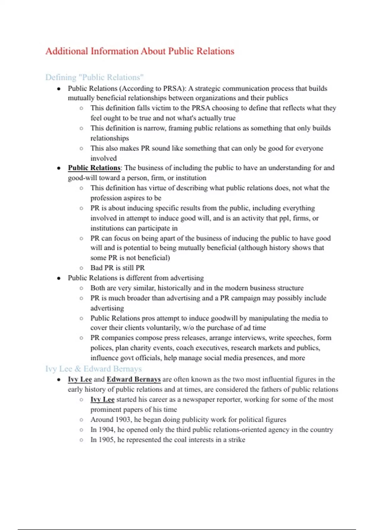 This document consists of notes from Media, Culture, and Society during the school year. The history of public relations, the labels involved within it, and its use is included in this set.