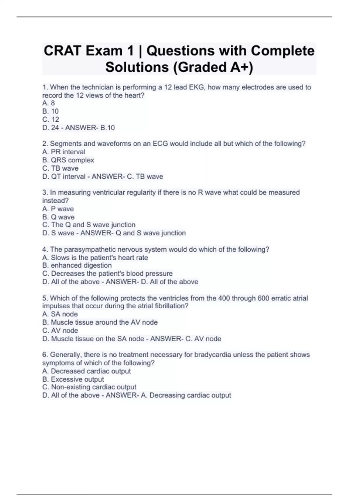 CRAT Exam 1 | Questions with Complete Solutions (Graded A+)1. When the technician is performing a 12 lead EKG, how many electrodes are used to record the 12 views of the heart? A. 8 B. 10 C. 12 D. 24 - ANSWER- B.10 2. Segments and waveforms on an ECG would include all but which of the following? A. PR interval B. QRS complex C. TB wave D. QT interval - ANSWER- C. TB wave 3. In measuring ventricular regularity if there is no R wave what could be measured instead? A. P wave B. Q wave C. The Q and S wave junction D. S wave - ANSWER- Q and S wave junction 4. The parasympathetic nervous system would do which of the following? A. Slows is the patient's heart rate B. enhanced digestion C. Decreases the patient's blood pressure D. All of the above - ANSWER- D. All of the above 5. Which of the following protects the ventricles from the 400 through 600 erratic atrial impulses that occur during the atrial fibrillation? A. SA node B. Muscle tissue around the AV node C. AV node D. Muscle tissue on the SA node - ANSWER- C. AV node 6. Generally, there is no treatment necessary for bradycardia unless the patient shows symptoms of which of the following? A. Decreased cardiac output B. Excessive output C. Non-existing cardiac output D. All of the above - ANSWER- A. Decreasing cardiac output
