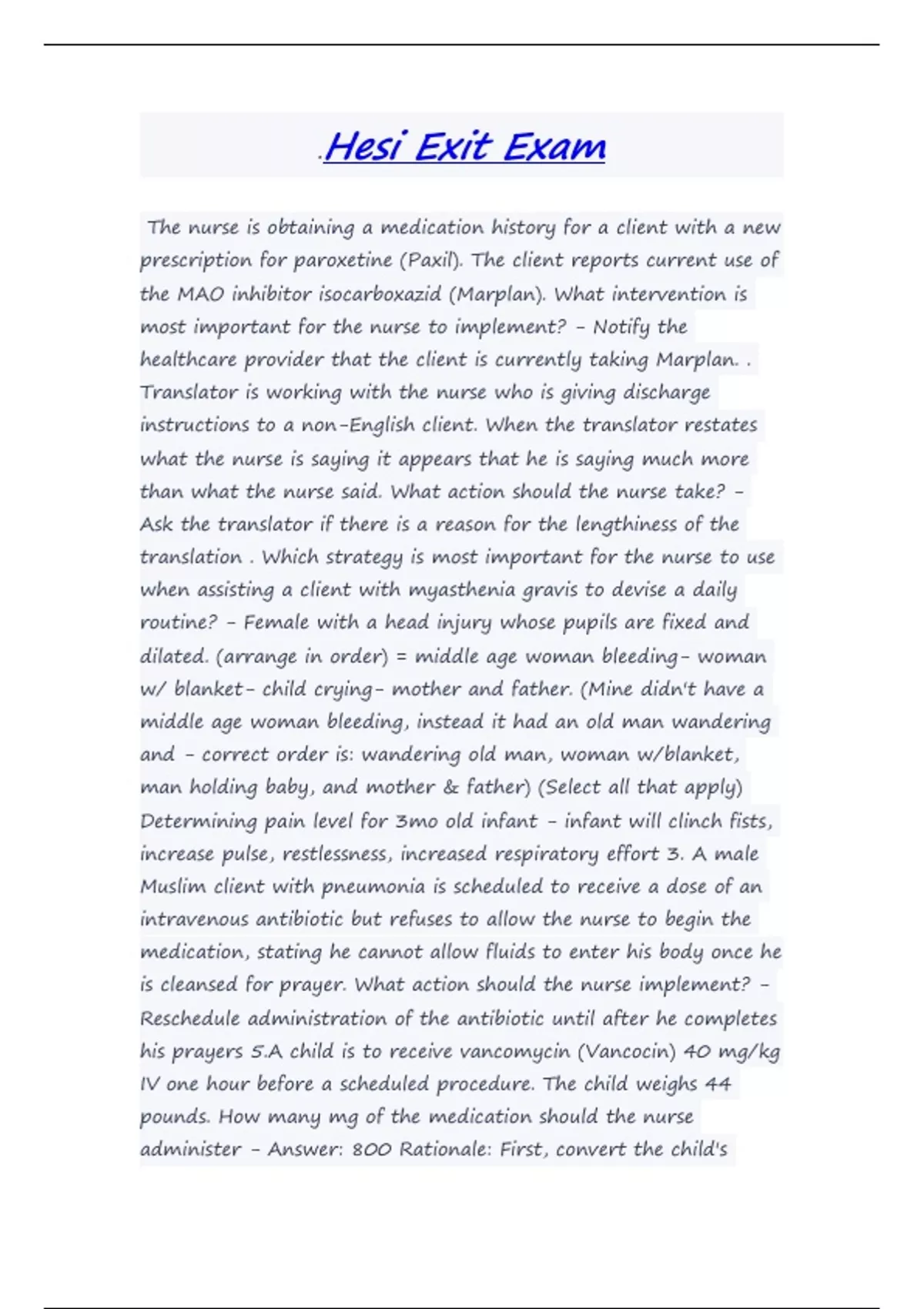 The nurse is obtaining a medication history for a client with a new prescription for paroxetine (Paxil). The client reports current use of the MAO inhibitor isocarboxazid (Marplan). What intervention is most important for the nurse to implement? - Notify the healthcare provider that the client is currently taking Marplan. . Translator is working with the nurse who is giving discharge instructions to a non-English client. When the translator restates what the nurse is saying it appears that he is saying much more than what the nurse said. What action should the nurse take? - Ask the translator if there is a reason for the lengthiness of the translation . Which strategy is most important for the nurse to use when assisting a client with myasthenia gravis to devise a daily routine? - Female with a head injury whose pupils are fixed and dilated. (arrange in order) = middle age woman bleeding- woman w/ blanket- child crying- mother and father. (Mine didn't have a