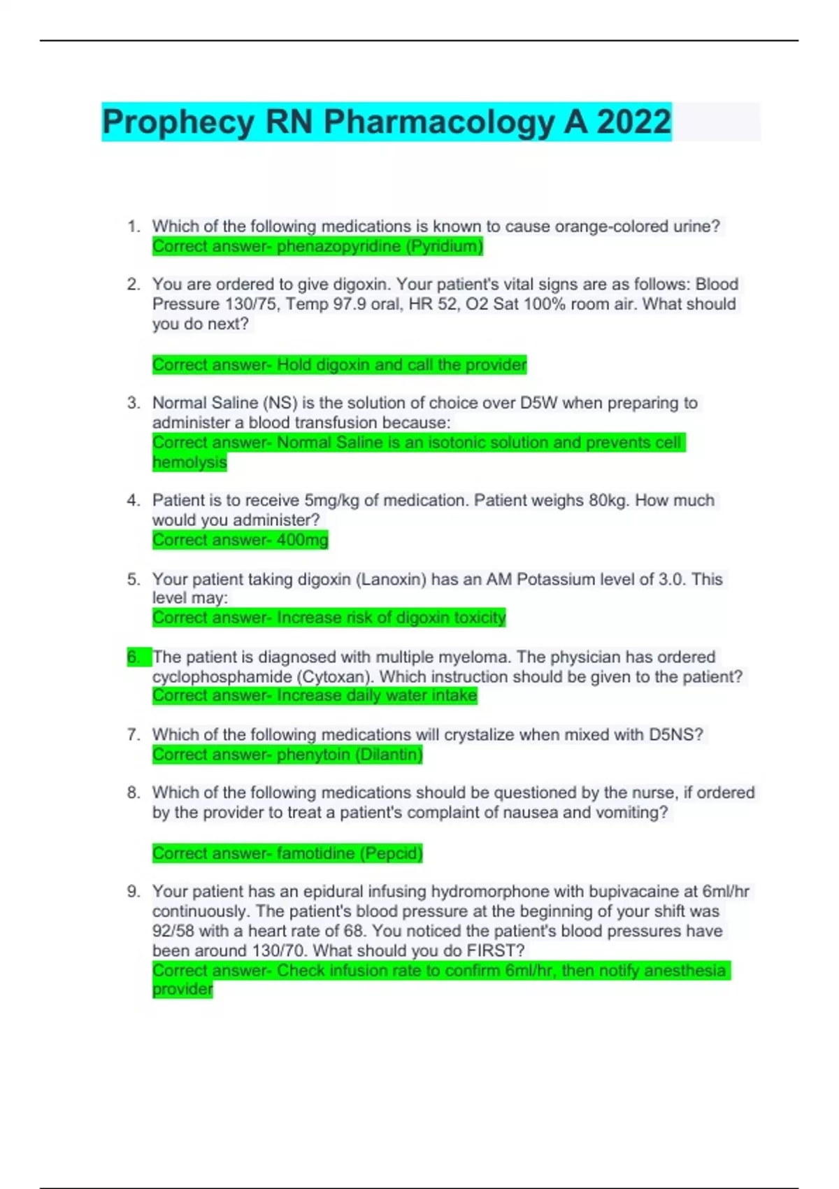 1. Which of the following medications is known to cause orange-colored urine? Correct answer- phenazopyridine (Pyridium) 2. You are ordered to give digoxin. Your patient's vital signs are as follows: Blood Pressure 130/75, Temp 97.9 oral, HR 52, O2 Sat 100% room air. What should you do next? Correct answer- Hold digoxin and call the provider 3. Normal Saline (NS) is the solution of choice over D5W when preparing to administer a blood transfusion because: Correct answer- Normal Saline is an isotonic solution and prevents cell hemolysis 4. Patient is to receive 5mg/kg of medication. Patient weighs 80kg. How much would you administer? Correct answer- 400mg