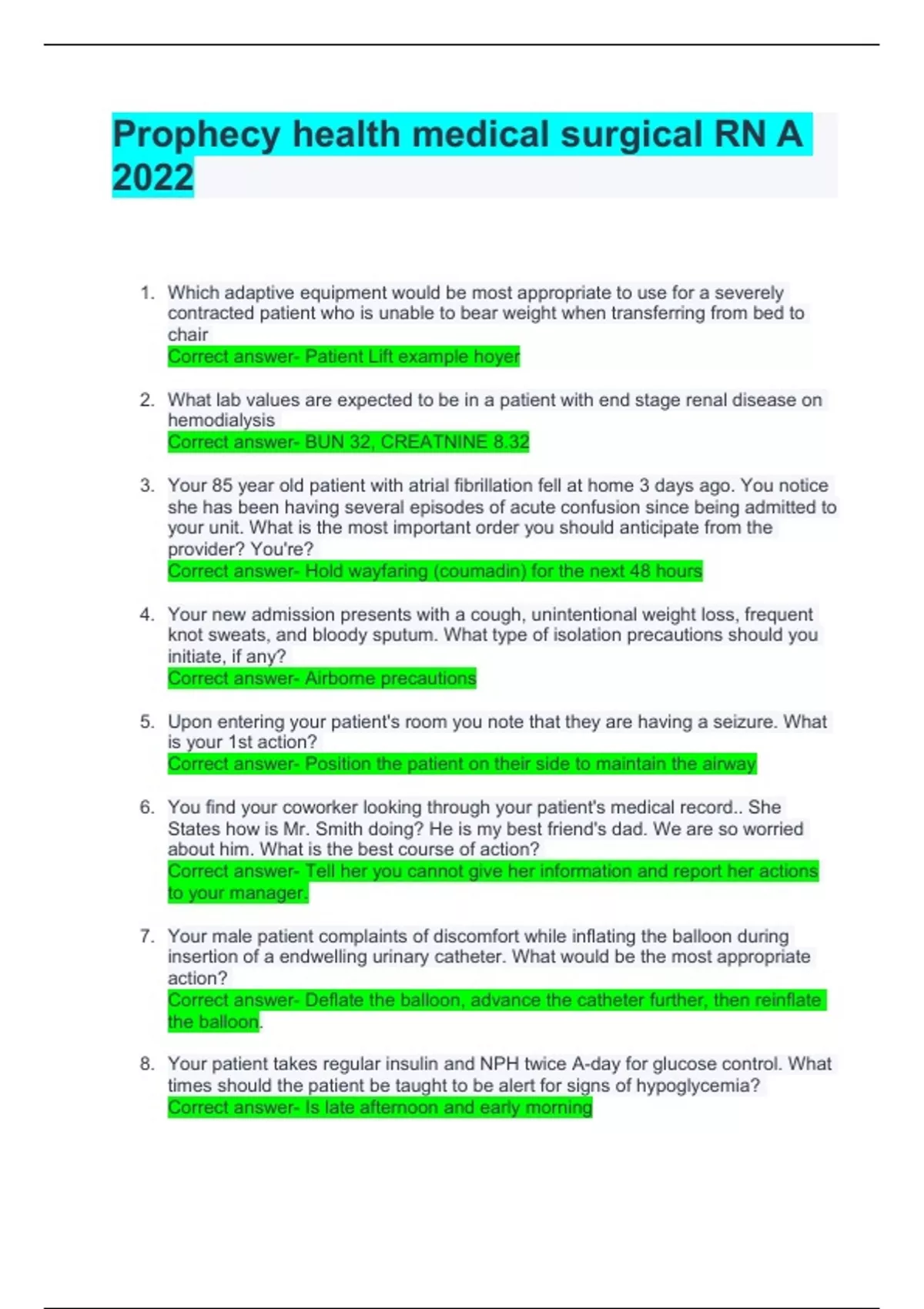 1. Which adaptive equipment would be most appropriate to use for a severely contracted patient who is unable to bear weight when transferring from bed to chair Correct answer- Patient Lift example hoyer 2. What lab values are expected to be in a patient with end stage renal disease on hemodialysis Correct answer- BUN 32, CREATNINE 8.32 3. Your 85 year old patient with atrial fibrillation fell at home 3 days ago. You notice she has been having several episodes of acute confusion since being admitted to your unit. What is the most important order you should anticipate from the provider? You're? Correct answer- Hold wayfaring (coumadin) for the next 48 hours 4. Your new admission presents with a cough, unintentional weight loss, frequent knot sweats, and bloody sputum. What type of isolation precautions should you initiate, if any? Correct answer- Airborne precaution