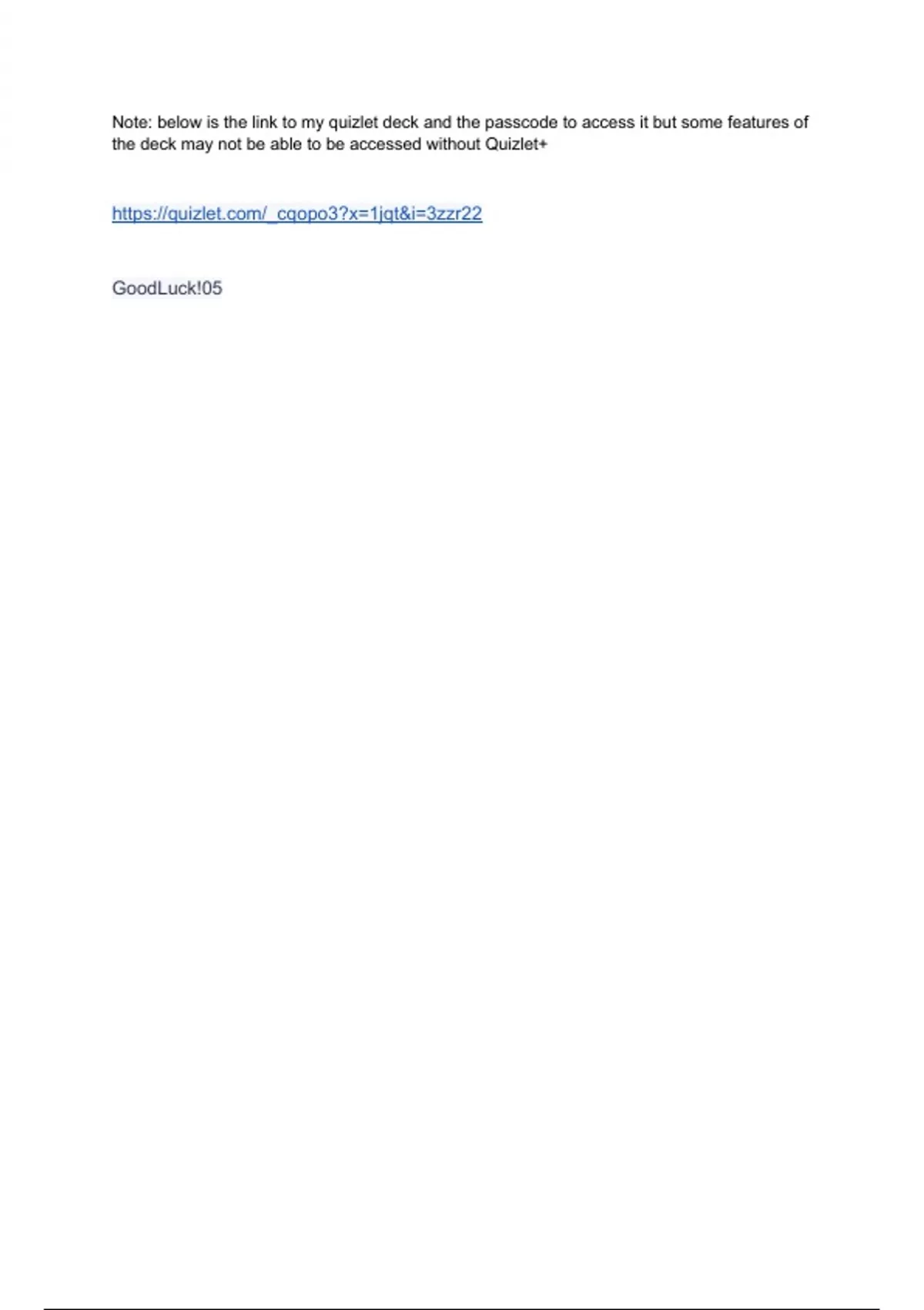 Note: below is the link to my quizlet deck and the passcode to access it but some features of