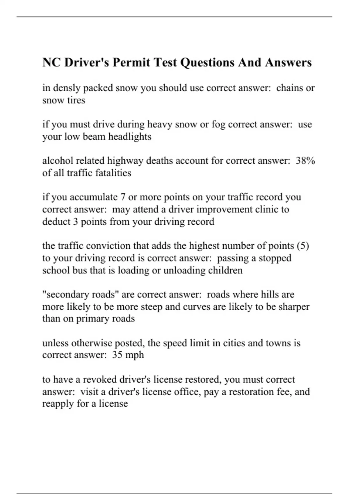 in densly packed snow you should use correct answer: chains or snow tires if you must drive during heavy snow or fog correct answer: use your low beam headlights alcohol related highway deaths account for correct answer: 38% of all traffic fatalities if you accumulate 7 or more points on your traffic record you correct answer: may attend a driver improvement clinic to deduct 3 points from your driving record the traffic conviction that adds the highest number of points (5) to your driving record is correct answer: passing a stopped school bus that is loading or unloading children "secondary roads" are correct answer: roads where hills are more likely to be more steep and curves are likely to be sharper than on primary roads unless otherwise posted, the speed limit in cities and towns is correct answer: 35 mph to have a revoked driver's license restored, you must correct answer: visit a driver's license office, pay a re