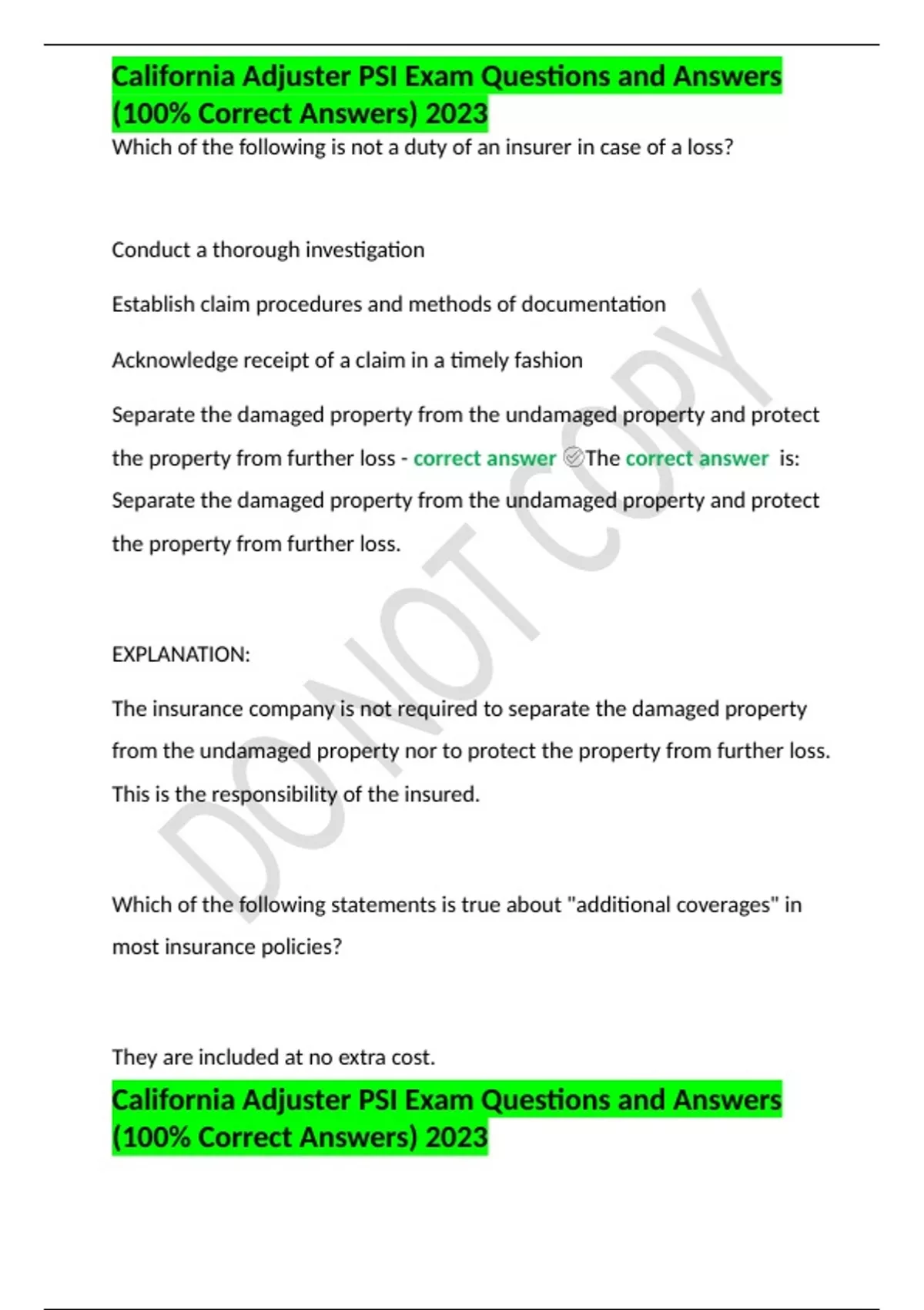 California Adjuster PSI Exam Questions and Answers (100% Correct Answers) 2023