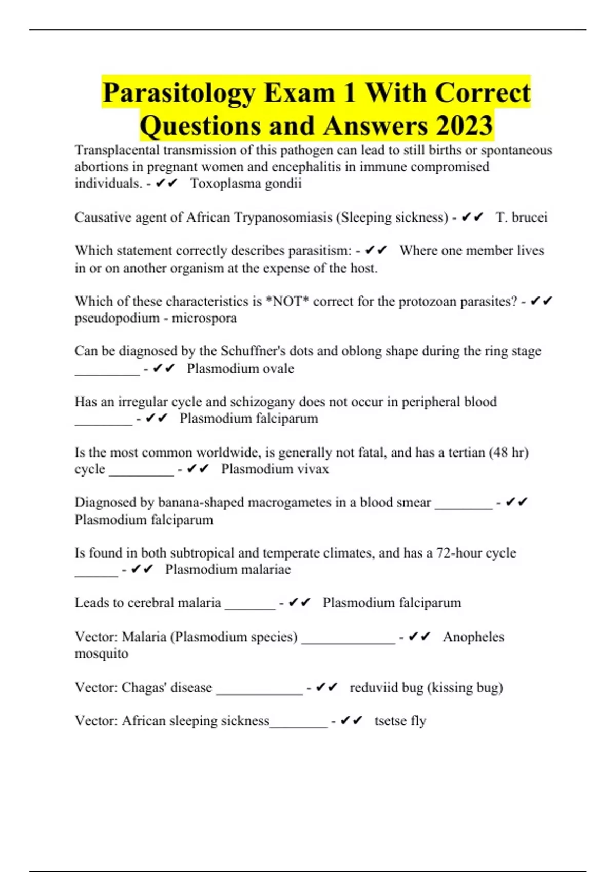 Parasitology Exam 1 With Correct Questions and Answers 2023