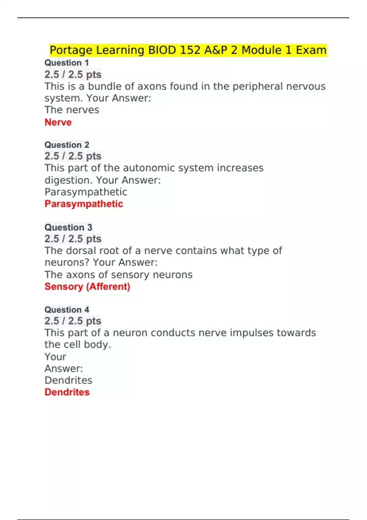 Portage Learning BIOD 152 A&P 2 Module 1 Exam Question 1 2.5 / 2.5 pts This is a bundle of axons found in the peripheral nervous system. Your Answer: The nerves Nerve Question 2 2.5 / 2.5 pts This part of the autonomic system increases digestion. Your Answer: Parasympathetic Parasympathetic
