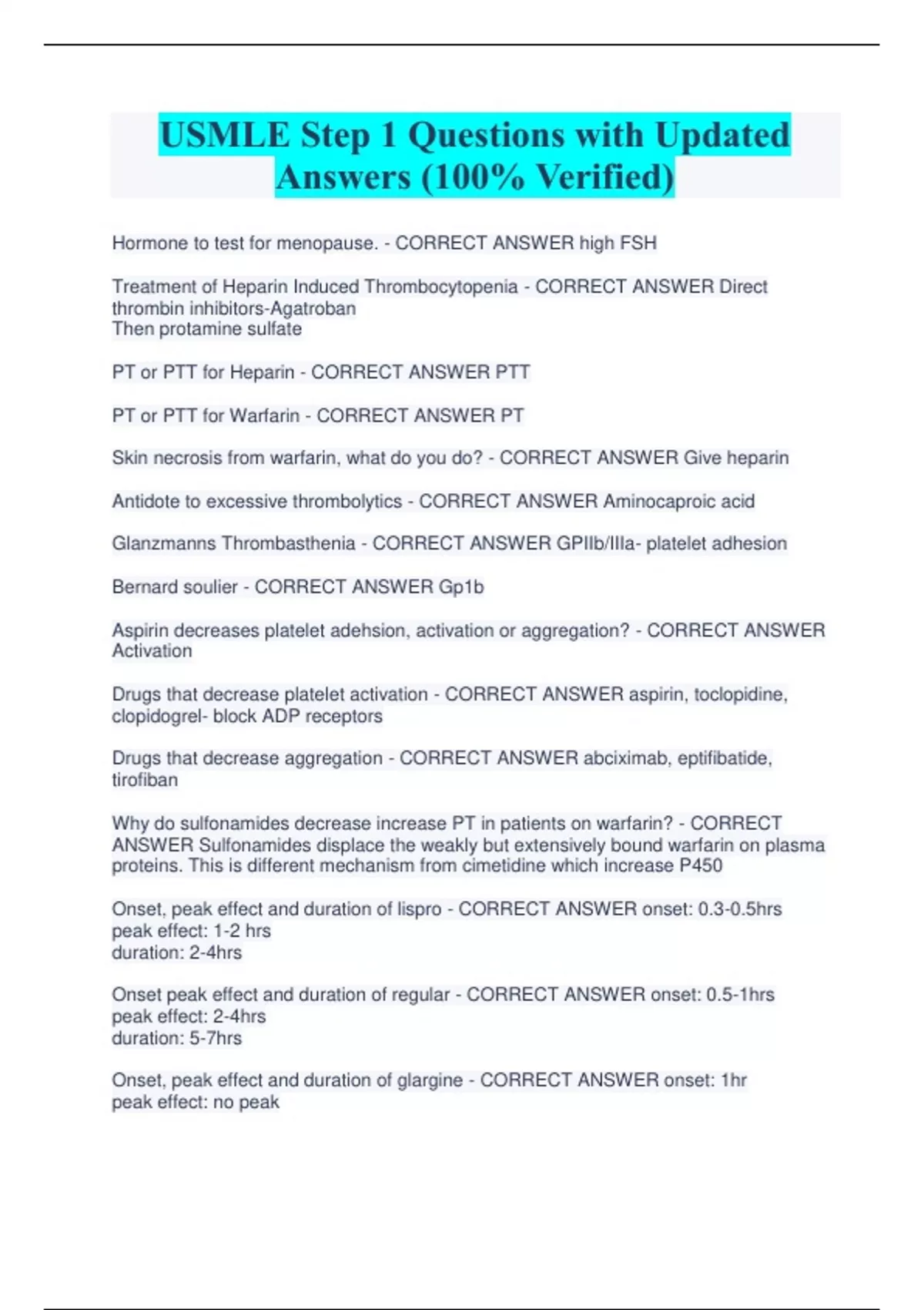 USMLE Step 1 Questions with Updated Answers (100% Verified) Hormone to test for menopause. - CORRECT ANSWER high FSH Treatment of Heparin Induced Thrombocytopenia - CORRECT ANSWER Direct thrombin inhibitors-Agatroban Then protamine sulfate PT or PTT for Heparin - CORRECT ANSWER PTT PT or PTT for Warfarin - CORRECT ANSWER PT Skin necrosis from warfarin, what do you do? - CORRECT ANSWER Give heparin Antidote to excessive thrombolytics - CORRECT ANSWER Aminocaproic acid Glanzmanns Thrombasthenia - CORRECT ANSWER GPIIb/IIIa- platelet adhesion Bernard soulier - CORRECT ANSWER Gp1b Aspirin decreases platelet adehsion, activation or aggregation? - CORRECT ANSWER Activation Drugs that decrease platelet activation - CORRECT ANSWER aspirin, toclopidine, clopidogrel- block ADP receptors Drugs that decrease aggregation - CORRECT ANSWER abciximab, eptifibatide, tirofiban Why do sulfonamides decrease increase PT in patients on warfarin? - CORRECT ANSWER Sulfonamides displace the weakly but extensively bound warfarin on plasma proteins. This is different mechanism from cimetidine which increase P450 Onset, peak effect and duration of lispro - CORRECT ANSWER onset: 0.3-0.5hrs peak effect: 1-2 hrs duration: 2-4hrs Onset peak effect and duration of regular - CORRECT ANSWER onset: 0.5-1hrs peak effect: 2-4hrs duration: 5-7hrs