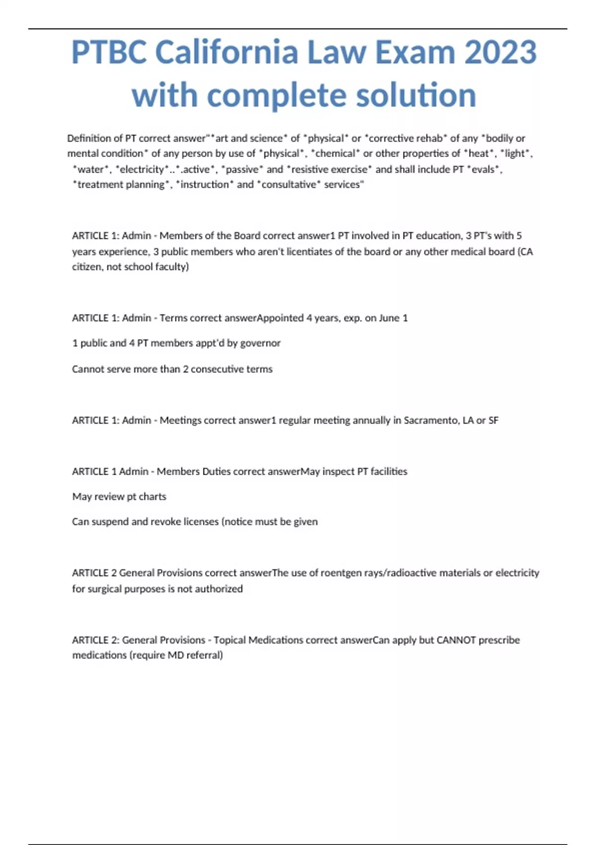 PTBC California Law Exam 2023 with complete solution