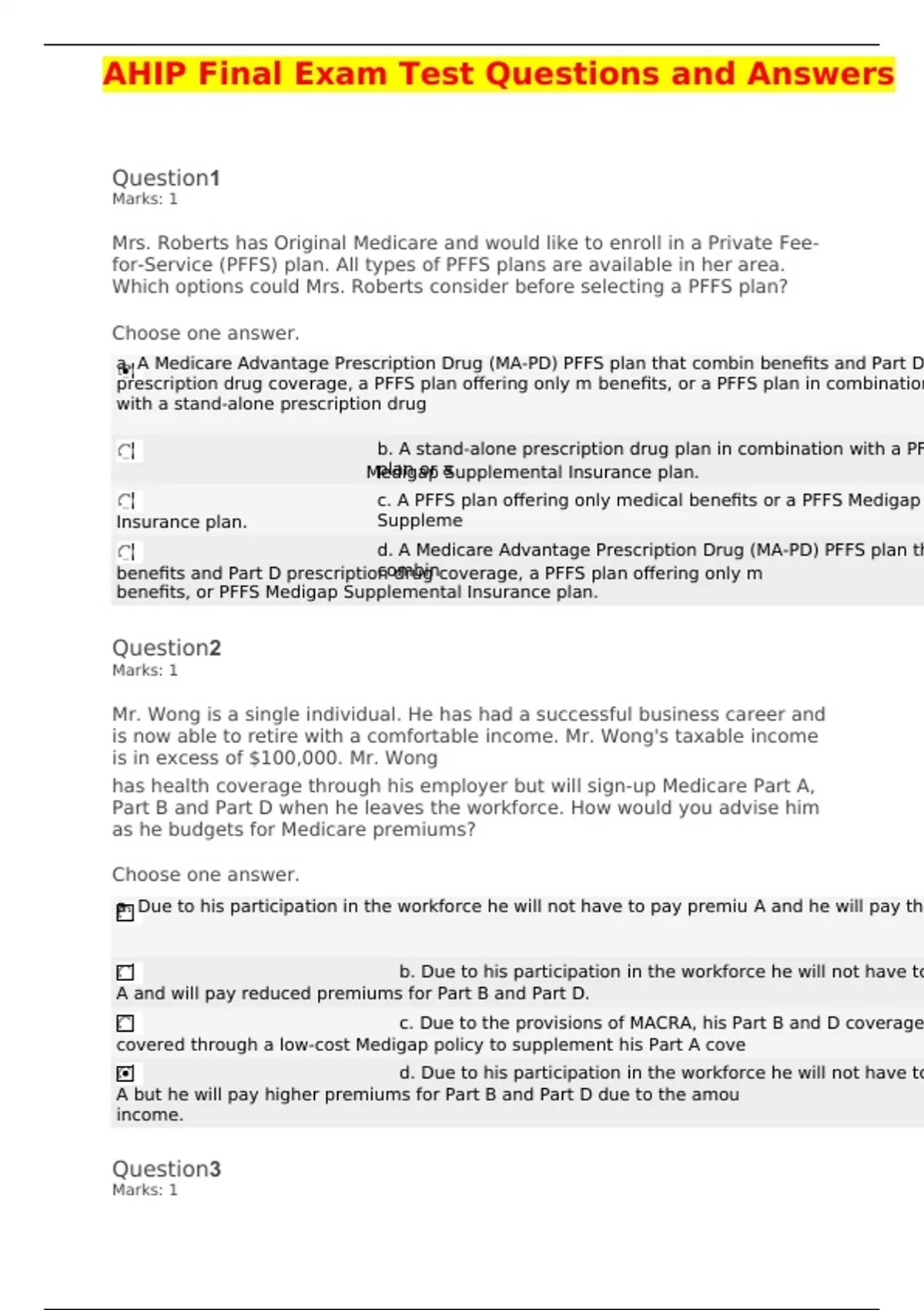income.covered through a low-cost Medigap policy to supplement his Part A coveA and will pay reduced premiums for Part B and Part D.a. Due to his participation in the workforce he will not have to pay premiu A and he will pay the lowest monthly premium rates for Part B and Part DAHIP Final Exam Test Questions and Answers Question1