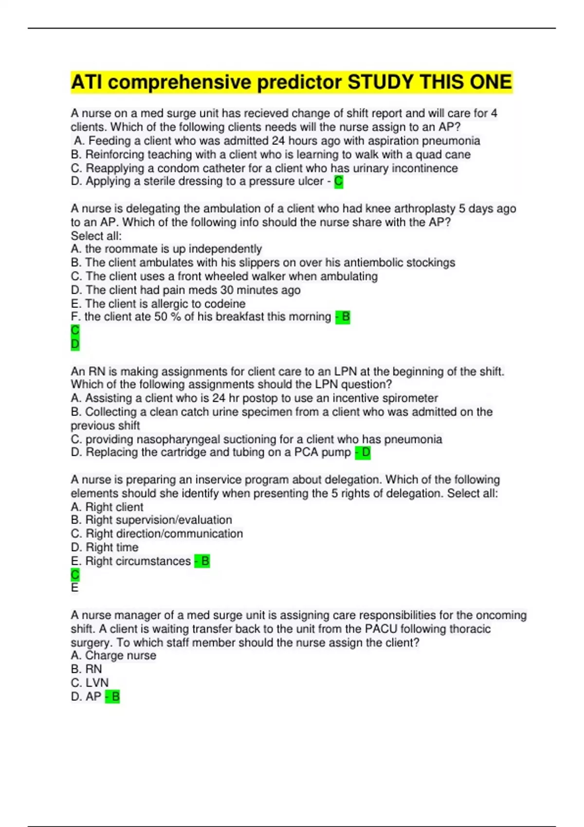 A nurse on a med surge unit has recieved change of shift report and will care for 4 clients. Which of the following clients needs will the nurse assign to an AP? A. Feeding a client who was admitted 24 hours ago with aspiration pneumonia B. Reinforcing teaching with a client who is learning to walk with a quad cane C. Reapplying a condom catheter for a client who has urinary incontinence D. Applying a sterile dressing to a pressure ulcer - C A nurse is delegating the ambulation of a client who had knee arthroplasty 5 days ago to an AP. Which of the following info should the nurse share with the AP? Select all: A. the roommate is up independently B. The client ambulates with his slippers on over his antiembolic stockings C. The client uses a front wheeled walker when ambulating D. The client had pain meds 30 minutes ago E. The client is allergic to codeine F. the client ate 50 % of his breakfast this morning - B C D An RN is making assignments for client care to an LPN at the beginning of the shift. Which of the following assignments should the LPN question? A. Assisting a client who is 24 hr postop to use an incentive spirometer B. Collecting a clean catch urine specimen from a client who was admitted on the previous shift C. providing nasopharyngeal suctioning for a client who has pneumonia D. Replacing the cartridge and tubing on a PCA pump - D A nurse is preparing an inservice program about delegation. Which of the following elements should she identify when presenting the 5 rights of delegation. Select all: A. Right client B. Right supervision/evaluation C. Right direction/communication D. Right time E. Right circumstances - B C E A nurse manager of a med surge unit is assigning care responsibilities for the oncoming shift. A client is waiting transfer back to the unit from the PACU following thoracic surgery. To which staff member should the nurse assign the client? A. Charge nurse B. RN C. LVN D. AP - B UNLOCK THE FULL DOCUMENT AND PASS YOUR EXAMS!!