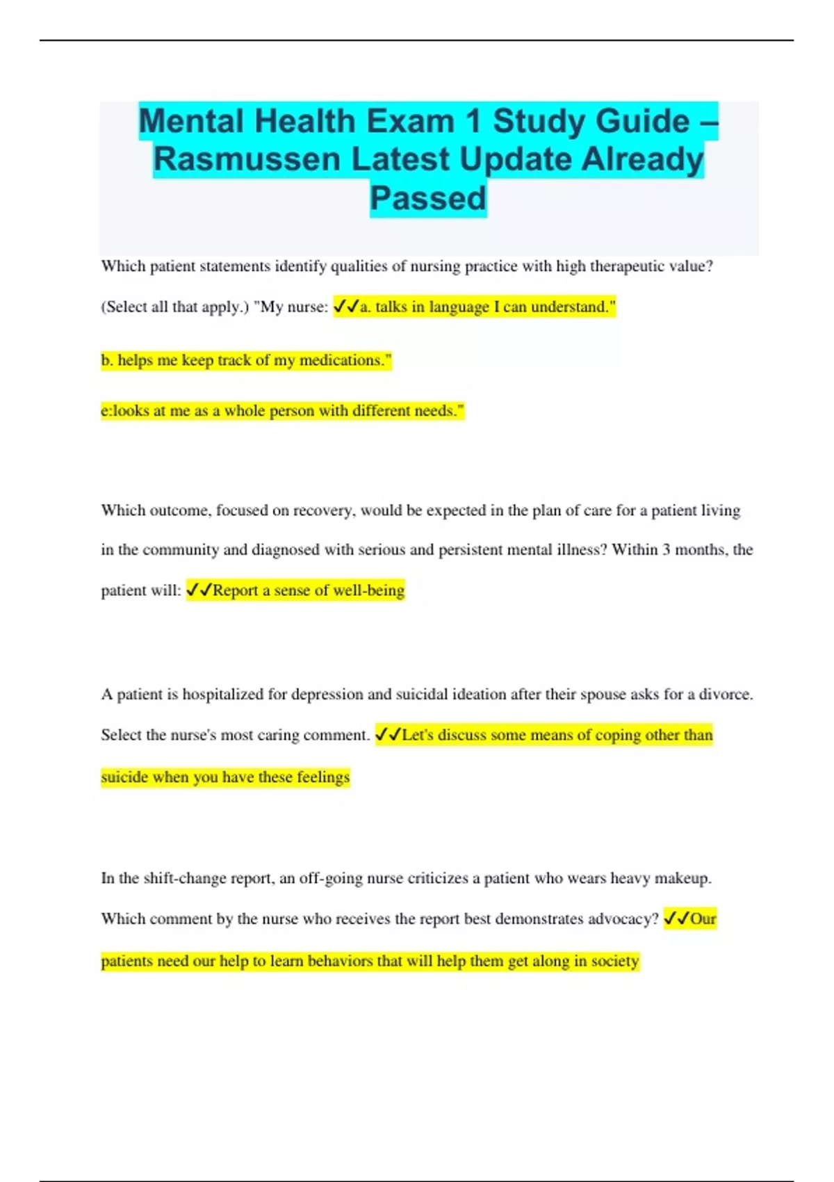 Mental Health Exam 1 Study Guide – Rasmussen Latest Update Already Passed