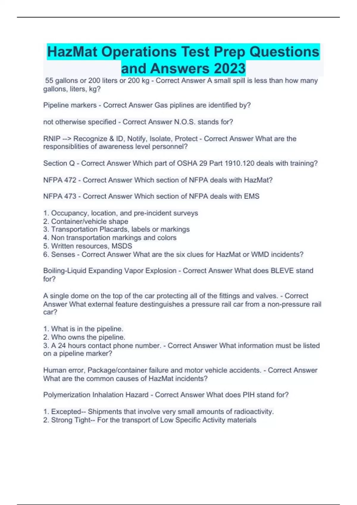 55 gallons or 200 liters or 200 kg - Correct Answer A small spill is less than how many gallons, liters, kg? Pipeline markers - Correct Answer Gas piplines are identified by? not otherwise specified - Correct Answer N.O.S. stands for? RNIP --> Recognize & ID, Notify, Isolate, Protect - Correct Answer What are the responsiblities of awareness level personnel? Section Q - Correct Answer Which part of OSHA 29 Part 1910.120 deals with training? NFPA 472 - Correct Answer Which section of NFPA deals with HazMat? NFPA 473 - Correct Answer Which section of NFPA deals with EMS 1. Occupancy, location, and pre-incident surveys 2. Container/vehicle shape 3. Transportation Placards, labels or markings 4. Non transportation markings and colors 5. Written resources, MSDS 6. Senses - Correct Answer What are the six clues for HazMat or WMD incidents? Boiling-Liquid Expanding Vapor Explosion - Correct Answer What does BLEVE stand for? A single dome on the top of the car protecting all of the fittings and valves. - Correct Answer What external feature destinguishes a pressure rail car from a non-pressure rail car? 1. What is in the pipeline. 2. Who owns the pipeline. 3. A 24 hours contact phone number. - Correct Answer What information must be listed on a pipeline marker? Human error, Package/container failure and motor vehicle accidents. - Correct Answer What are the common causes of HazMat incidents? Polymerization Inhalation Hazard - Correct Answer What does PIH stand for? 1. Excepted-- Shipments that involve very small amounts of radioactivity. 2. Strong Tight-- For the transport of Low Specific Activity materials