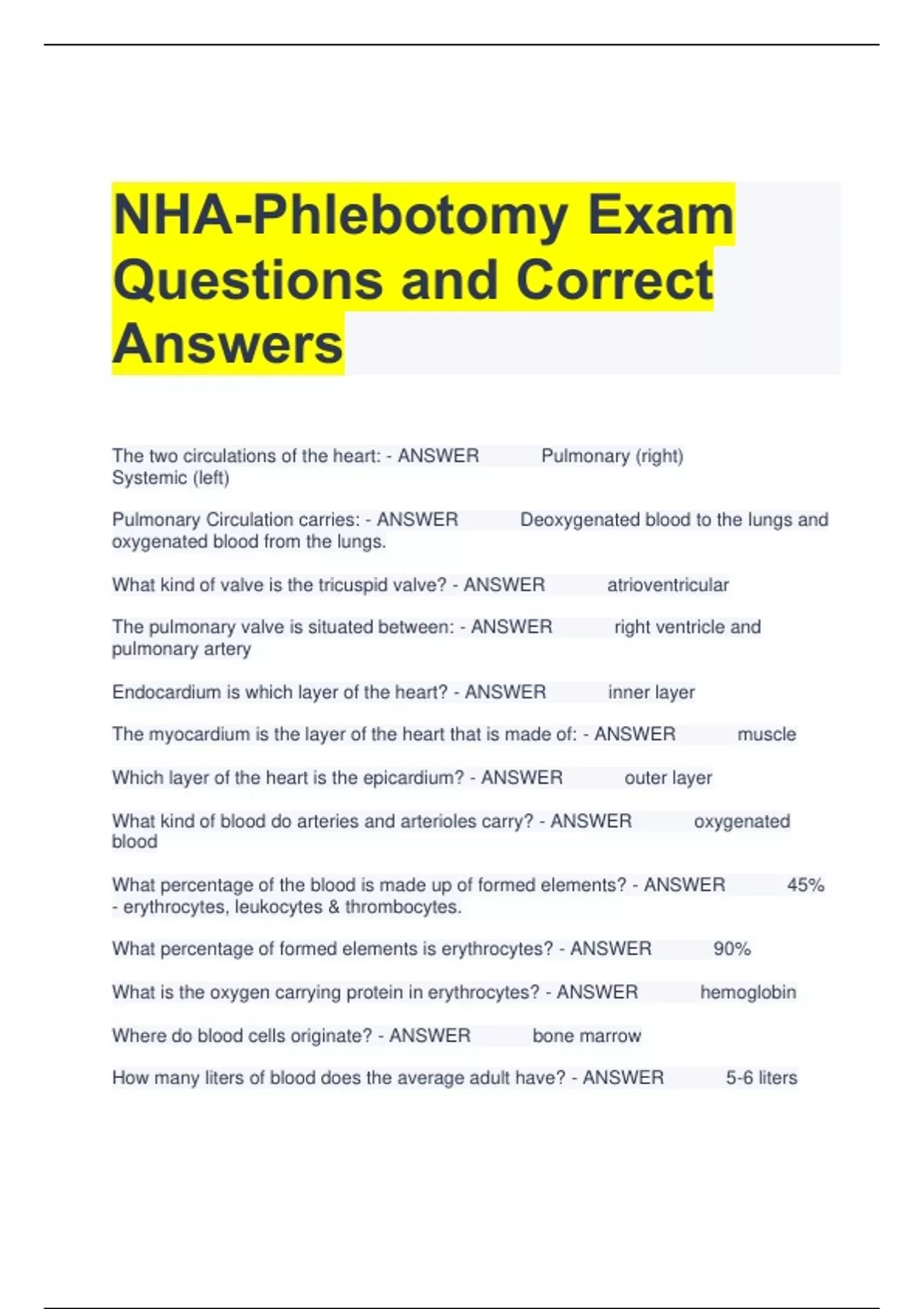 NHA-Phlebotomy Exam Questions and Correct Answers The two circulations of the heart: - ANSWER Pulmonary (right) Systemic (left) Pulmonary Circulation carries: - ANSWER Deoxygenated blood to the lungs and oxygenated blood from the lungs. What kind of valve is the tricuspid valve? - ANSWER atrioventricular The pulmonary valve is situated between: - ANSWER right ventricle and pulmonary artery Endocardium is which layer of the heart? - ANSWER inner layer The myocardium is the layer of the heart that is made of: - ANSWER muscle Which layer of the heart is the epicardium? - ANSWER outer layer What kind of blood do arteries and arterioles carry? - ANSWER oxygenated blood What percentage of the blood is made up of formed elements? - ANSWER 45% - erythrocytes, leukocytes & thrombocytes. What percentage of formed elements is erythrocytes? - ANSWER 90% What is the oxygen carrying protein in erythrocytes? - ANSWER hemoglobin Where do blood cells originate? - ANSWER bone marrow
