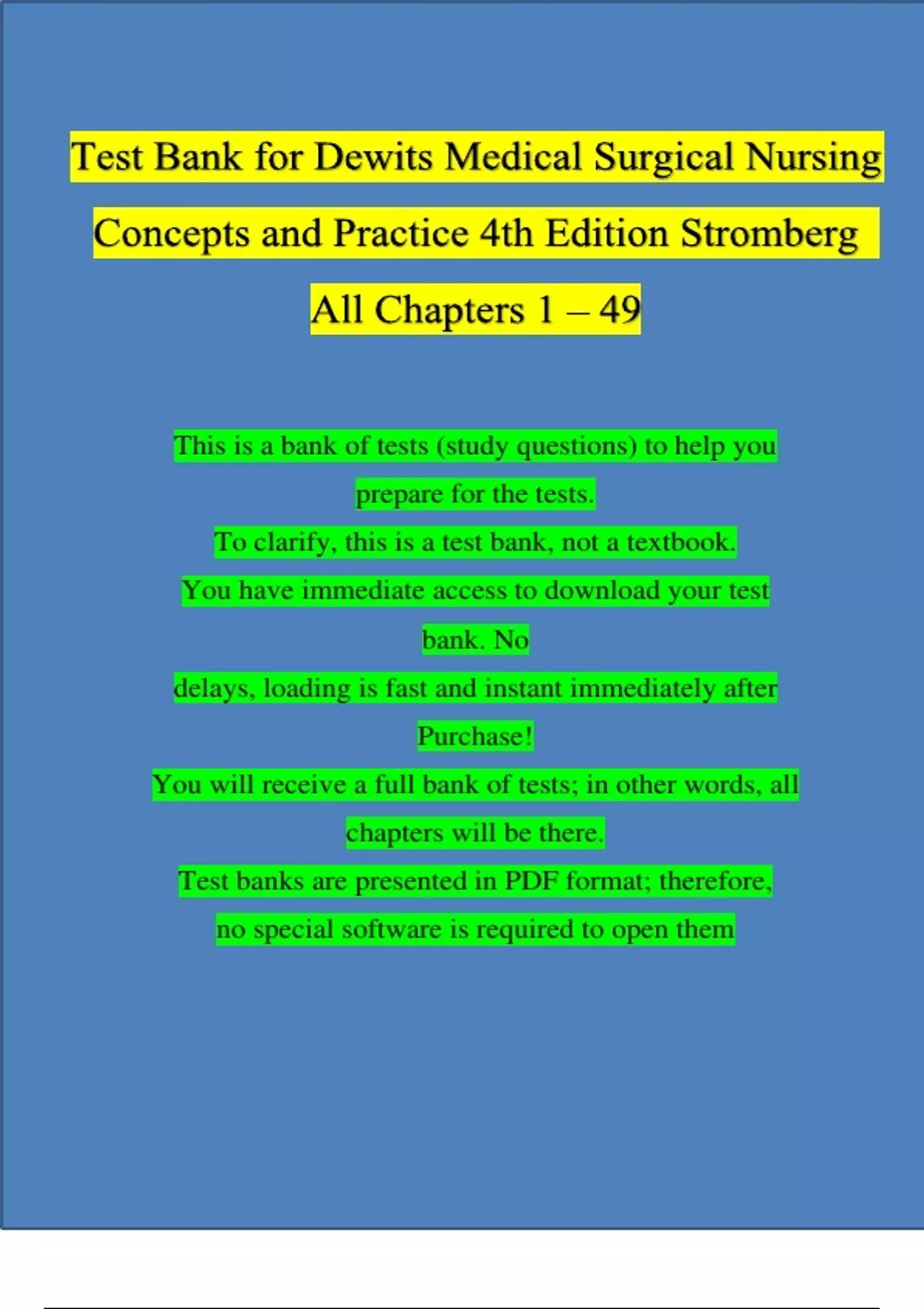 Dewit's Medical Surgical Nursing Concepts and Practice 5th Edition By Holly K. Stromberg TEST BANK |Complete Chapter 1 - 49 | 100 % Verified Dewit's Medical Surgical Nursing Concepts and Practice 5th Edition By Holly K. Stromberg TEST BANK |Complete Chapter 1 - 49 | 100 % Verified