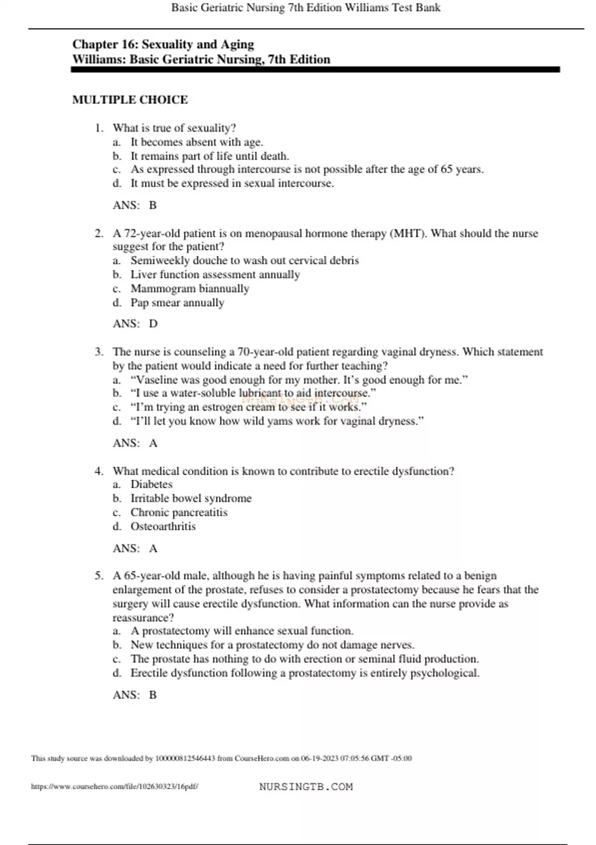 Chapter 16: Sexuality and Aging Williams: Basic Geriatric Nursing, 7th Edition MULTIPLE CHOICE 1. What is true of sexuality? a. It becomes absent with age. b. It remains part of life until death. c. As expressed through intercourse is not possible after the age of 65 years. d. It must be expressed in sexual intercourse. ANS: B 2. A 72-year-old patient is on menopausal hormone therapy (MHT). What should the nurse suggest for the patient? a. Semiweekly douche to wash out cervical debris b. Liver function assessment annually c. Mammogram biannually d. Pap smear annually ANS: D 3. The nurse is counseling a 70-year-old patient regarding vaginal dryness. Which statement by the patient would indicate a need for further teaching? a. “Vaseline was good enough for my mother. It’s good enough for me.” b. “I use a water-soluble lubricant to aid intercourse.” c. “I’m trying an estro