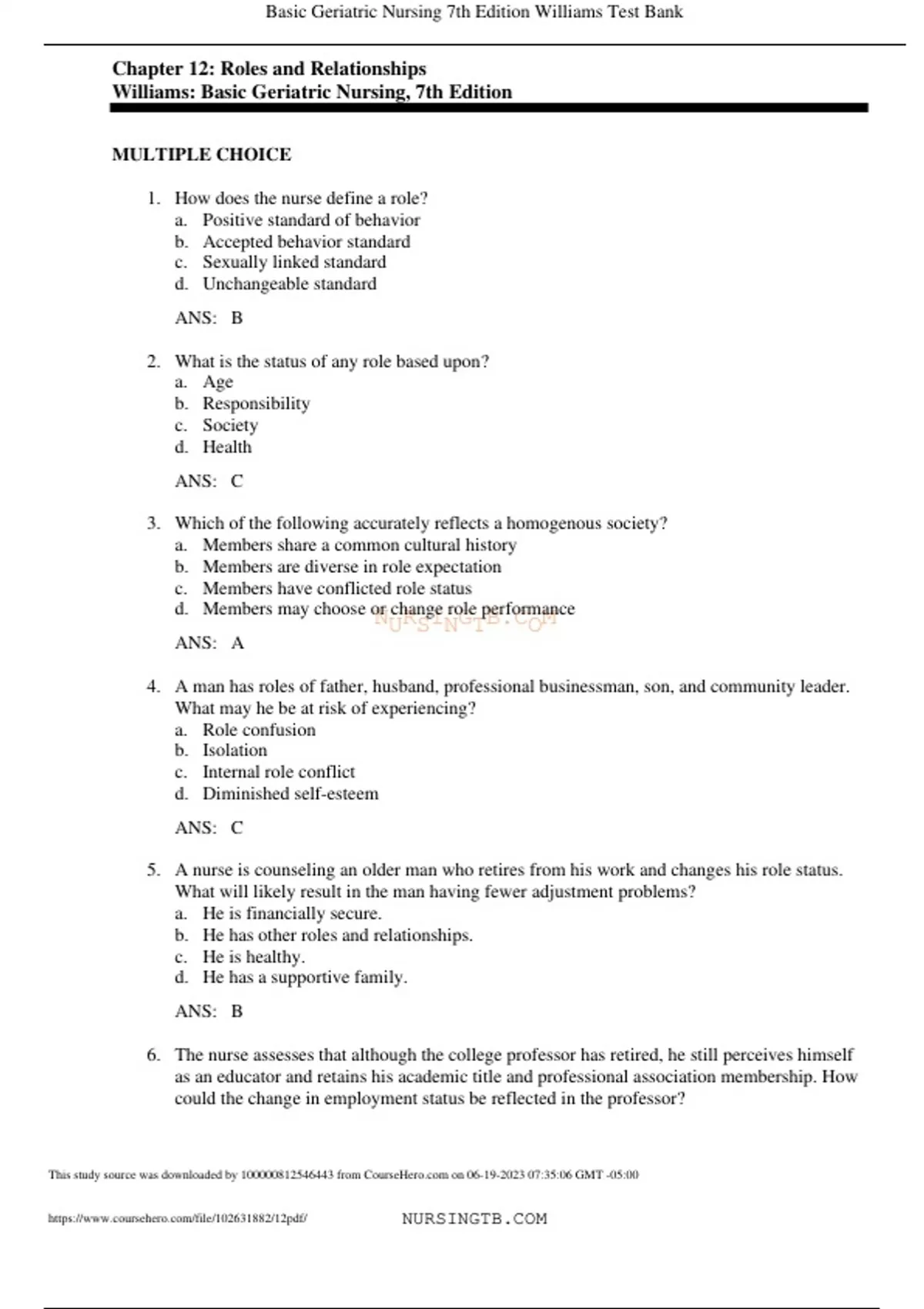 Chapter 12: Roles and Relationships Williams: Basic Geriatric Nursing, 7th Edition MULTIPLE CHOICE 1. How does the nurse define a role? a. Positive standard of behavior b. Accepted behavior standard c. Sexually linked standard d. Unchangeable standard ANS: B 2. What is the status of any role based upon? a. Age b. Responsibility c. Society d. Health ANS: C 3. Which of the following accurately reflects a homogenous society? a. Members share a common cultural history b. Members are diverse in role expectation c. Members have conflicted role status d. Members may choose or change role performance ANS: A 4. A man has roles of father, husband, professional businessman, son, and community leader. What may he be at risk of experiencing? a. Role confusion b. Isolation c. Internal role conflict d. Diminished self-esteem ANS: C 5. A nurse is counseling an older man who retires from his work and changes his role status. What will likely result in the man having fewer adjustment problems? a. He is financially secure. b. He has other roles and relationships. c. He is healthy. d. He has a supportive family. ANS: B 6. The nurse assesses
