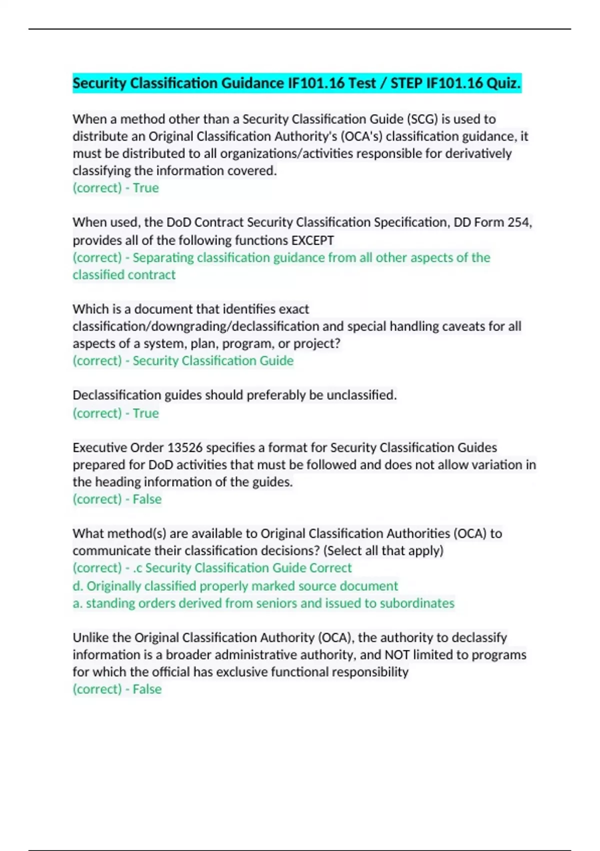Security Classification Guidance IF101.16 Test / STEP IF101.16 Quiz. When a method other than a Security Classification Guide (SCG) is used to distribute an Original Classification Authority's (OCA's) classification guidance, it must be distributed to all organizations/activities responsible for derivatively classifying the information covered. When used, the DoD Contract Security Classification Specification, DD Form 254, provides all of the following functions EXCEPT Which is a document that identifies exact classification/downgrading/declassification and special handling caveats for all aspects of a system, plan, program, or project? Declassification guides should preferably be unclassified. Executive Order 13526 specifies a format for Security Classification Guides prepared for DoD activities that must be followed and does not allow variation in the heading information of the guides. What method(s) are available to Original Classification Authorities (OCA) to communicate their classification decisions? (Select all that apply) Unlike the Original Classification Authority (OCA), the authority to declassify information is a broader administrative authority, and NOT limited to programs for which the official has exclusive functional responsibility From the list below, select the factor NOT normally considered in making security classification determinations. Within the DoD, which of the following officials may NOT issue declassification guides? Individuals designated to exercise Original Classification Authority (OCA) are not required to receive any specific training prior to exercising this authority. In assessing the net national impact of the classification of information, the Original Classification Authority (OCA) should consider the fact of possession of the information by the U.S. Government. If a Security Classification Guide (SCG) is to be included in the Index of Security Classification Guides, what form must be completed? Original Classification Authorities (OCA) must ensure downgrading, if warranted, and declassification instructions are assigned to all information determined to warrant classification. The requirements and minimum standards for developing security classification guidance can be found in which DoD policy document? Under which national policy has the DoD issued its own implementing guidance for classifying information? Before writing a Security Classification Guide, what sources of classification guidance should the Original Classification Authority (OCA) check to find out what already exists? Security declassification guides must cite a future date within five years when they will be reviewed and updated. Which might require a Security Classification Guide (SCG) to be forwarded under separate cover?