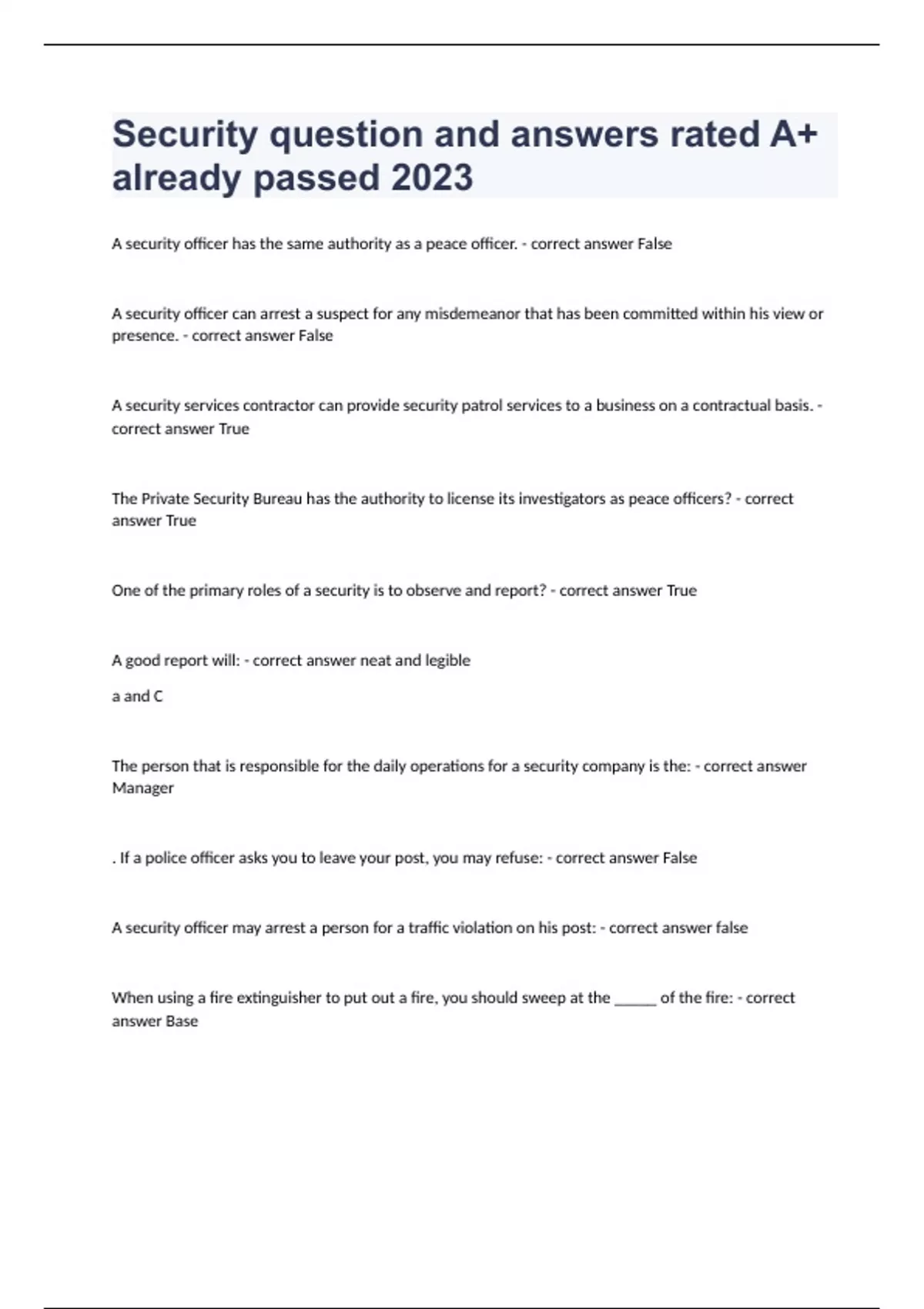 Security question and answers rated A+ already passed 2023A security officer has the same authority as a peace officer. - correct answer False A security officer can arrest a suspect for any misdemeanor that has been committed within his view or presence. - correct answer False A security services contractor can provide security patrol services to a business on a contractual basis. - correct answer True The Private Security Bureau has the authority to license its investigators as peace officers? - correct answer True One of the primary roles of a security is to observe and report? - correct answer True A good report will: - correct answer neat and legible a and C The person that is responsible for the daily operations for a security company is the: - correct answer Manager . If a police officer asks you to leave your post, you may refuse: - correct answer False A security officer may arrest a person for a traffic violation on his post: - correct answer false When using a fire extinguisher to put out a fire, you should sweep at the _____ of the fire: - correct answer Base