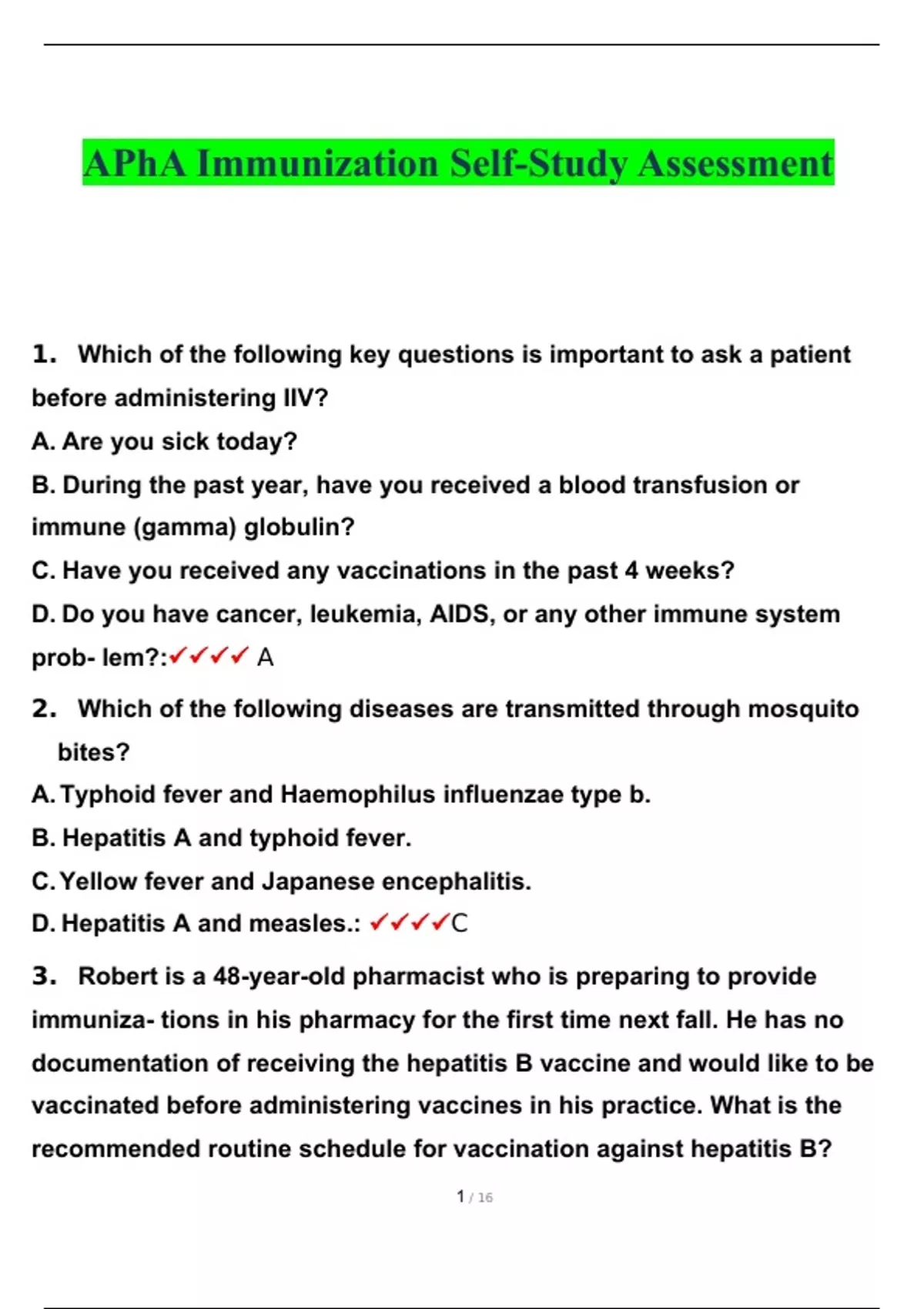 APhA Immunization Self-Study Assessment Questions with Correct Answers