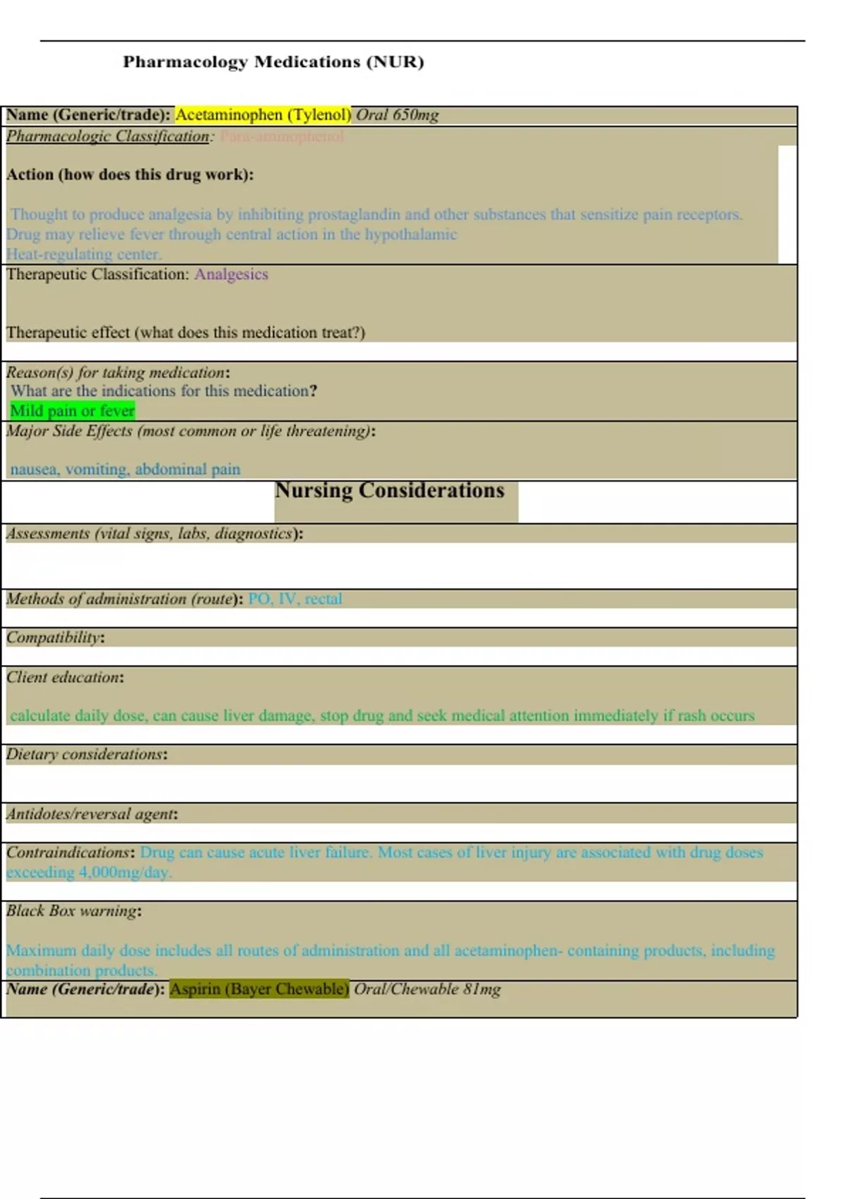 Name (Generic/trade): Acetaminophen (Tylenol) Oral 650mg