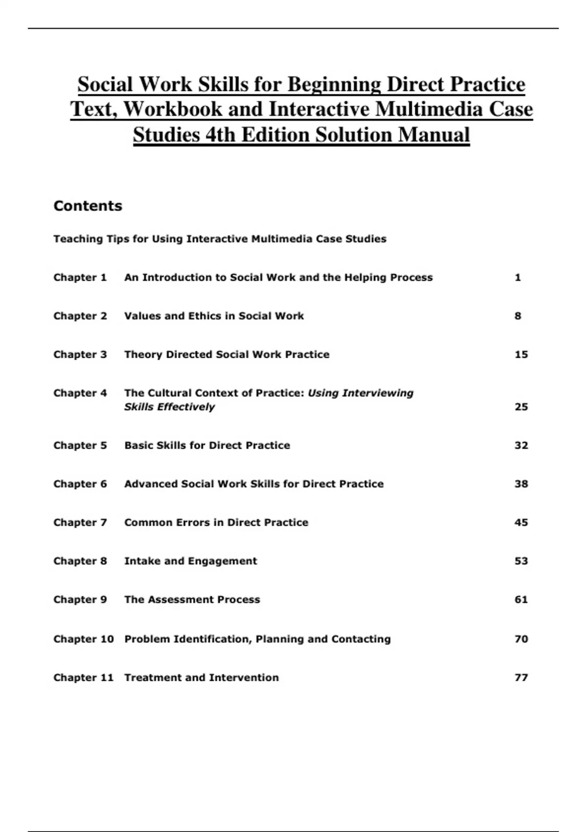 Social Work Skills for Beginning Direct Practice Text, Workbook and Interactive Multimedia Case Studies 4th Edition Solution Manual Complete Solution Manual Social Work Skills for Beginning Direct Practice Text, Workbook and Interactive Multimedia Case Studies 4th Edition Questions & Answers with rationales PDF File All Pages All Chapters Grade A+