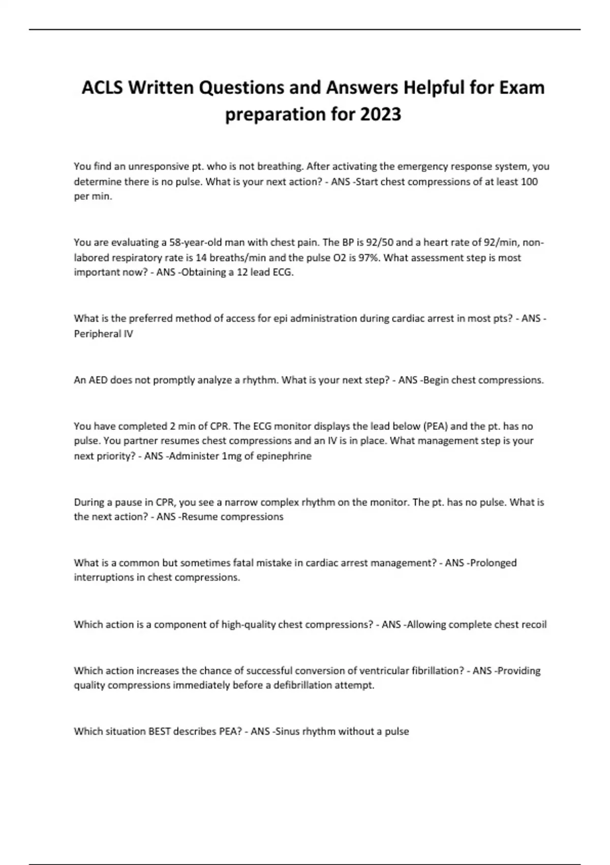 ACLS Written Questions and Answers Helpful for Exam preparation for 2023 You find an unresponsive pt. who is not breathing. After activating the emergency response system, you determine there is no pulse. What is your next action? - ANS -Start chest compressions of at least 100 per min. You are evaluating a 58-year-old man with chest pain. The BP is 92/50 and a heart rate of 92/min, non-labored respiratory rate is 14 breaths/min and the pulse O2 is 97%. What assessment step is most important now? - ANS -Obtaining a 12 lead ECG. What is the preferred method of access for epi administration during cardiac arrest in most pts? - ANS -Peripheral IV An AED does not promptly analyze a rhythm. What is your next step? - ANS -Begin chest compressions. You have completed 2 min of CPR. The ECG monitor displays the lead below (PEA) and the pt. has no pulse. You partner resumes chest compressions and an IV is in place. What management step is your next priority? - ANS -Administer 1mg of epinephrine During a pause in CPR, you see a narrow complex rhythm on the monitor. The pt. has no pulse. What is the next action? - ANS -Resume compressions What is a common but sometimes fatal mistake in cardiac arrest management? - ANS -Prolonged interruptions in chest compressions. Which action is a component of high-quality chest compressions? - ANS -Allowing complete chest recoil Which action increases the chance of successful conversion of ventricular fibrillation? - ANS -Providing quality compressions immediately before a defibrillation attempt. Which situation BEST describes PEA? - ANS -Sinus rhythm without a pulse