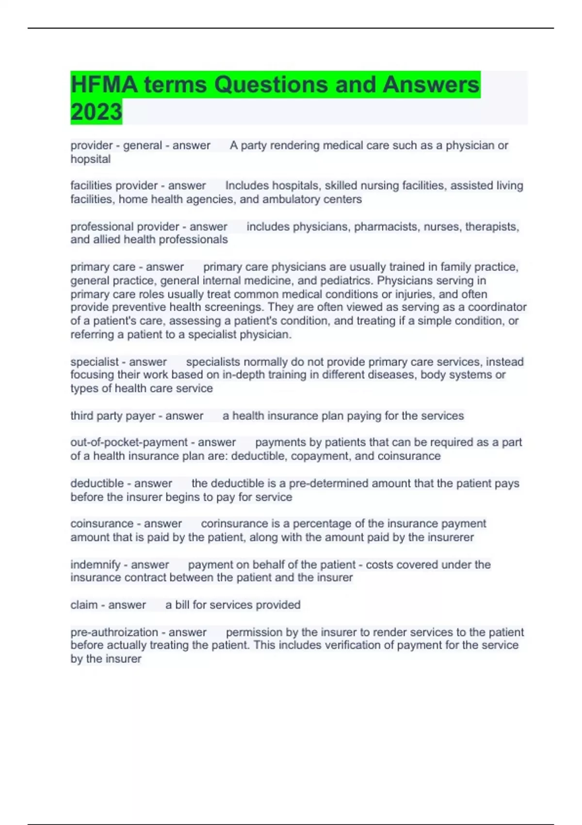 HFMA terms Questions and Answers 2023