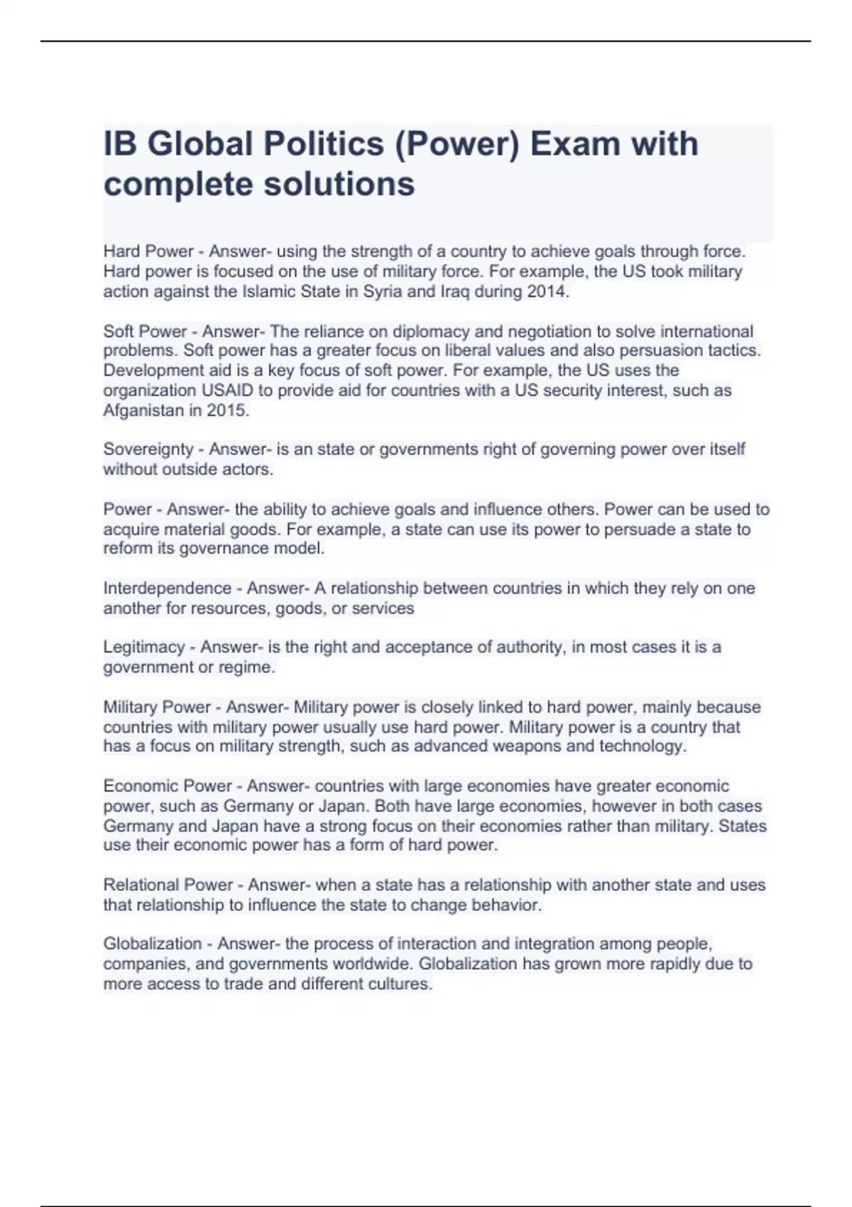 Hard Power - Answer- using the strength of a country to achieve goals through force. Hard power is focused on the use of military force. For example, the US took military action against the Islamic State in Syria and Iraq during 2014. Soft Power - Answer- The reliance on diplomacy and negotiation to solve international problems. Soft power has a greater focus on liberal values and also persuasion tactics. Development aid is a key focus of soft power. For example, the US uses the organization USAID to provide aid for countries with a US security interest, such as Afganistan in 2015. Sovereignty - Answer- is an state or governments right of governing power over itself without outside actors. Power - Answer- the ability to achieve goals and influence others. Power can be used to acquire material goods. For example, a state can use its power to persuade a state to reform its governance model. Interdependence - Answer- A relationship between countries in which they rely on one another for resources, goods, or services Legitimacy - Answer- is the right and acceptance of authority, in most cases it is a government or regime. Military Power - Answer- Military power is closely linked to hard power, mainly because countries with military power usually use hard power. Military power is a country that has a focus on military strength, such as advanced weapons and technology. Economic Power - Answer- countries with large economies have greater economic power, such as Germany or Japan. Both have large economies, however in both cases Germany and Japan have a strong focus on their economies rather than military. States use their economic power has a form of hard power. Relational Power - Answer- when a state has a relationship with another state and uses that relationship to influence the state to change behavior. Globalization - Answer- the process of interaction and integration among people, companies, and governments worldwide. Globalization has grown more rapidly due to more access to trade and different cultures. Structural Power - Answer- when states influence the political ideas, structural ideas, and frameworks of global politics. For example, some states may push other states into uses a more capitalist democratic free-market economic model. Social/cultural power - Answer- through globalization some cultures have been able to export their cultural resources across th