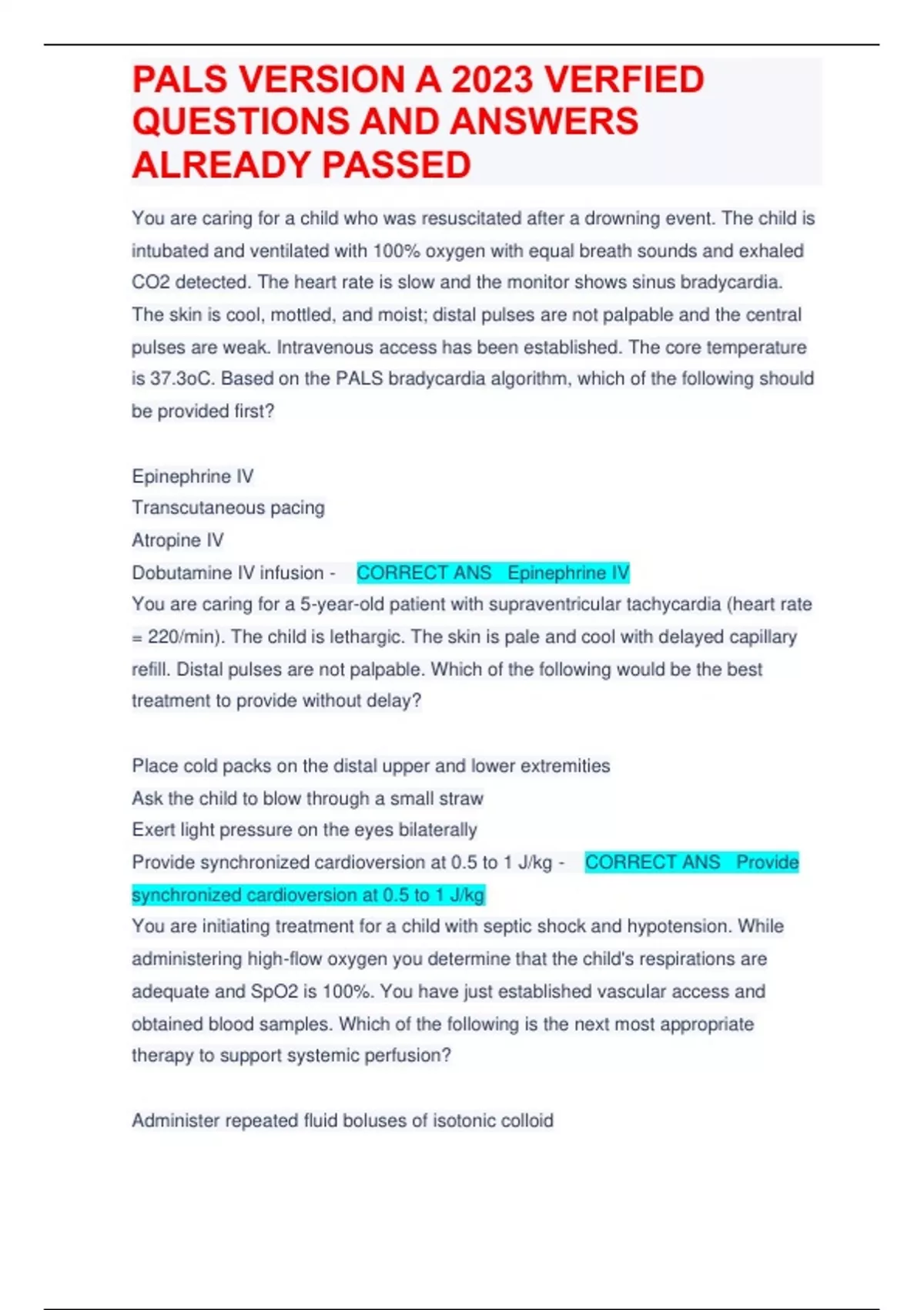 You are caring for a child who was resuscitated after a drowning event. The child is intubated and ventilated with 100% oxygen with equal breath sounds and exhaled CO2 detected. The heart rate is slow and the monitor shows sinus bradycardia. The skin is cool, mottled, and moist; distal pulses are not palpable and the central pulses are weak. Intravenous access has been established. The core temperature is 37.3oC. Based on the PALS bradycardia algorithm, which of the following should be provided first? Epinephrine IV Transcutaneous pacing Atropine IV Dobutamine IV infusion - CORRECT ANS Epinephrine IV You are caring for a 5-year-old patient with supraventricular tachycardia (heart rate = 220/min). The child is lethargic. The skin is pale and cool with delayed capillary refill. Distal pulses are not palpable. Which of the following would be the best treatment to provide without delay? Place cold packs on the distal upper and lower extremities Ask the child to blow through a small straw Exert light pressure on the eyes bilaterally Provide synchronized cardioversion at 0.5 to 1 J/kg - CORRECT ANS Provide synchronized cardioversion at 0.5 to 1 J/kg You are initiating treatment for a child with septic shock and hypotension. While administering high-flow oxygen you determine that the child's respirations are adequate and SpO2 is 100%. You have just established vascular access and obtained blood samples. Which of the following is the next most appropriate therapy to support systemic perfusion? Administer repeated fluid boluses of isotonic colloid Administer repeated fluid boluses of isotonic crystalloid Begin immediate dopamine infusion Begin immediate dobutamine infusion - CORRECT ANS Administer repeated fluid boluses of isotonic crystalloid You are treating an 8-year-old with ventricular tachycardia with pulses and adequate perfusion. You attempted synchronized cardioversion without success. While seeking expert consultation, it would be most appropriate to: Administer a loading dose of milrinone Consider possible metabolic and toxicologic causes Initiate overdrive pacing transcutaneously Deliver an unsynchronized shock - CORRECT ANS Consider possible metabolic and toxicologic causes You are caring for a 2-year-old unconscious patient who is intubated and receiving mechanical ventilation. The child's heart rate suddenly drops to 40/min and his color becomes mottled. You should respond to these changes by: Increasing the ventilator rate Increasing tidal volume Increasing positive end-expiratory pre