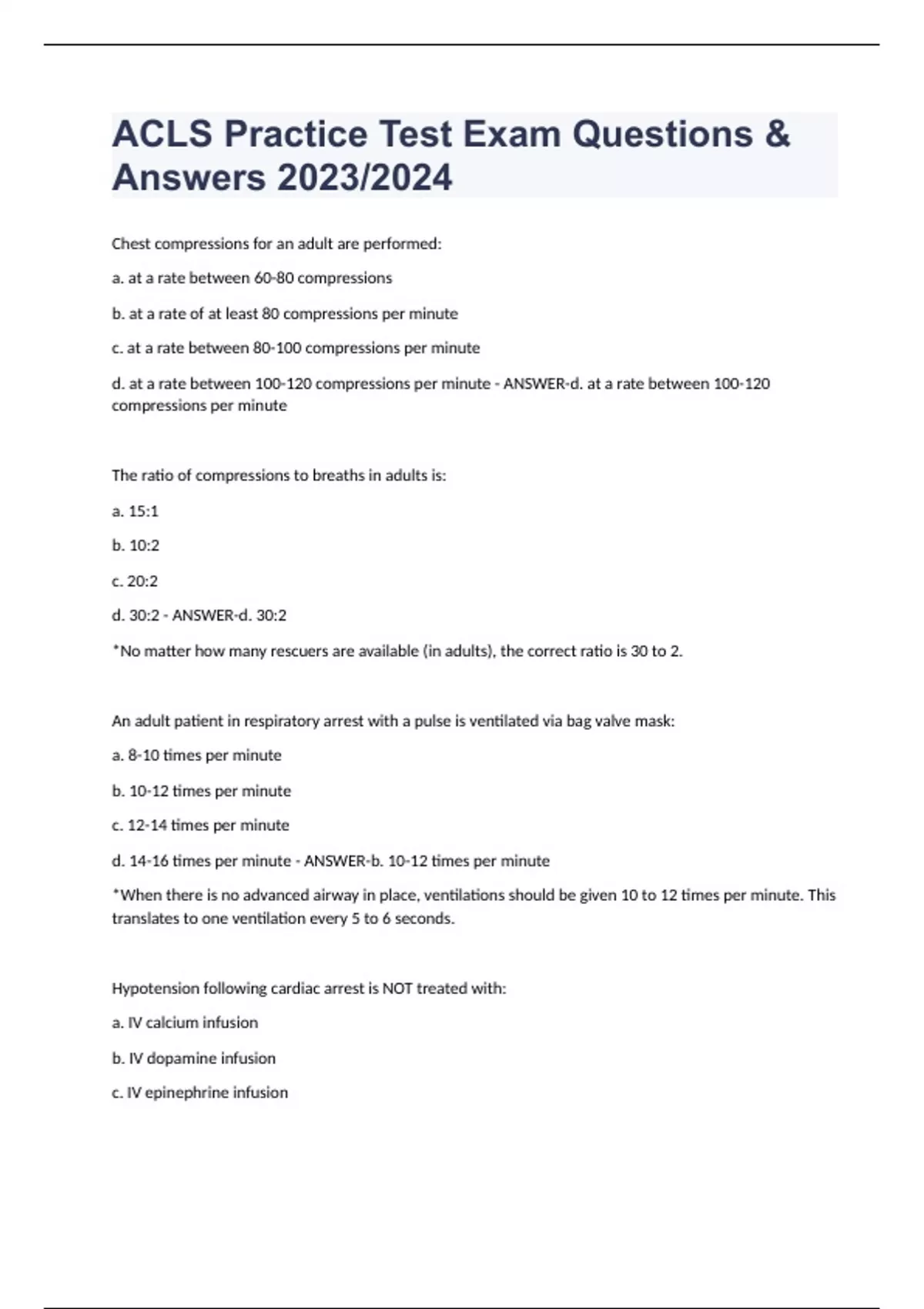 ACLS Practice Test Exam Questions & Answers 2023/2024 Chest compressions for an adult are performed: a. at a rate between 60-80 compressions b. at a rate of at least 80 compressions per minute c. at a rate between 80-100 compressions per minute d. at a rate between 100-120 compressions per minute - ANSWER-d. at a rate between 100-120 compressions per minute The ratio of compressions to breaths in adults is: a. 15:1 b. 10:2 c. 20:2 d. 30:2 - ANSWER-d. 30:2 *No matter how many rescuers are available (in adults), the correct ratio is 30 to 2. An adult patient in respiratory arrest with a pulse is ventilated via bag valve mask: a. 8-10 times per minute b. 10-12 times per minute c. 12-14 times per minute d. 14-16 times per minute - ANSWER-b. 10-12 times per minute *When there is no advanced airway in place, ventilations should be given 10 to 12 times per minute. This translates to one ventilation every 5 to 6 seconds. Hypotension following cardiac arrest is NOT treated with: a. IV calcium infusion b. IV dopamine infusion c. IV epinephrine infusion