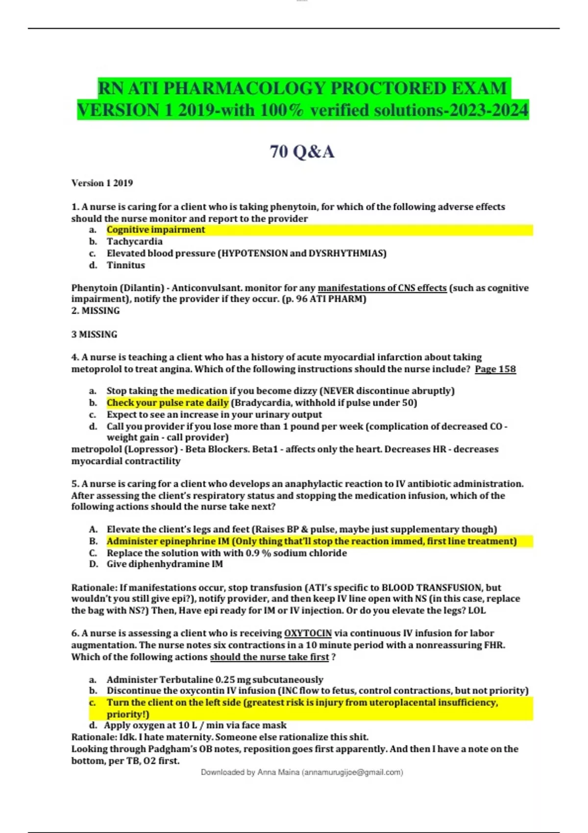 RN ATI PHARMACOLOGY PROCTORED EXAM VERSION 1 2019-with 100% verified solutions-