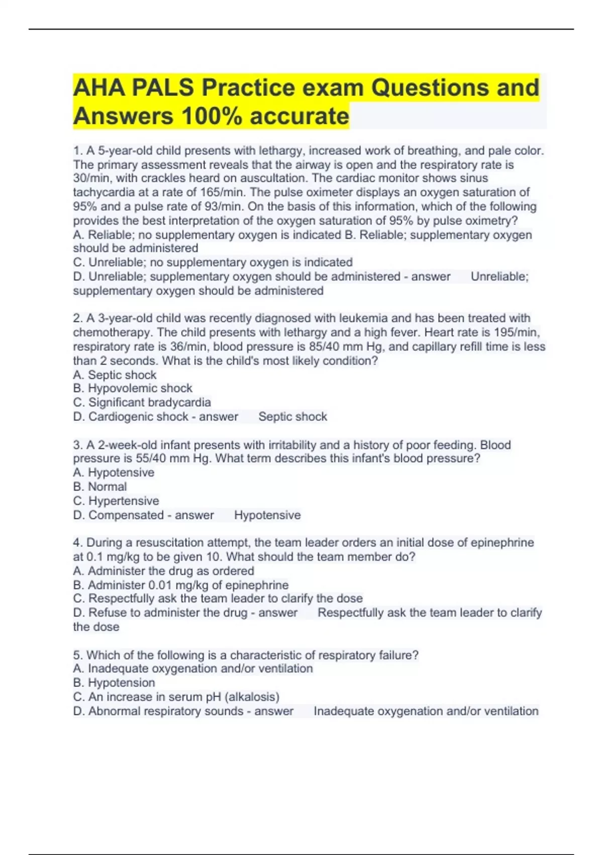AHA PALS Practice exam Questions and Answers 100% accurate 1. A 5-year-old child presents with lethargy, increased work of breathing, and pale color. The primary assessment reveals that the airway is open and the respiratory rate is 30/min, with crackles heard on auscultation. The cardiac monitor shows sinus tachycardia at a rate of 165/min. The pulse oximeter displays an oxygen saturation of 95% and a pulse rate of 93/min. On the basis of this information, which of the following provides the best interpretation of the oxygen saturation of 95% by pulse oximetry? A. Reliable; no supplementary oxygen is indicated B. Reliable; supplementary oxygen should be administered C. Unreliable; no supplementary oxygen is indicated D. Unreliable; supplementary oxygen should be administered Unreliable; supplementary oxygen should be administered 2. A 3-year-old child was recently diagnosed with leukemia and has been treated with chemotherapy. The child presents with lethargy and a high fever. Heart rate is 195/min, respiratory rate is 36/min, blood pressure is 85/40 mm Hg, and capillary refill time is less than 2 seconds. What is the child's most likely condition? A. Septic shock B. Hypovolemic shock C. Significant bradycardia D. Cardiogenic shock Septic shock 3. A 2-week-old infant presents with irritability and a history of poor feeding. Blood pressure is 55/40 mm Hg. What term describes this infant's blood pressure? A. Hypotensive B. Normal C. Hypertensive D. Compensated Hypotensive 4. During a resuscitation attempt, the team leader orders an initial dose of epinephrine at 0.1 mg/kg to be given 10. What should the team member do? A. Administer the drug as ordered B. Administer 0.01 mg/kg of epinephrine C. Respectfully ask the team leader to clarify the dose D. Refuse to administer the drug Respectfully ask the team leader to clarify the dose 5. Which of the following is a characteristic of respiratory failure? A. Inadequate oxygenation and/or ventilation B. Hypotension C. An increase in serum pH (alkalosis) D. Abnormal respiratory sounds Inadequate oxygenation and/or ventilation 6. Which of the following is most likely to produce a prolonged expiratory phase and wheezing? A. Disordered control of breathing B. Hypovolemic shock C. Lower airway obstruction D. Upper airway obstruction Lower airway obstruction 7. A 4-year-old child presents with seizures and irregular respirations. The seizures stopped a few minutes ago. Which of the following most likely to be abnormal? A. Vascular resistance B. Pulse rate C. Lung compliance D. Control of breathing Control of breathing 8. What abnormality is most likely to be present in children with acute respiratory distress caused by lung tissue disease? A. Decreased oxygen saturation B. Stridor C. Normal respiratory rate D. Decreased respiratory effort Decreased oxygen saturation 9. An alert 2-year-old child with an increased work of breathing and pink color is being evaluated. Heart rate is 110/min, and respiratory rate is 30/min. What would best describe this patient's condition? A. Respiratory distress B. Respiratory arrest C. Respiratory failure D. Disordered control of breathing Respiratory distress 10. The parents of a 7-year-old child who is undergoing chemotherapy report that the child has been febrile and has not been feeling well, with recent onset of lethargy. Assessment reveals the following: The child is difficult to arouse, with pale color. The child's heart rate is 160/min, respiratory rate is 30/min, blood pressure is 76/45 mm Hg, capillary refill time is 5 to 6 seconds, and temperature is 103°F (39.4°C). What is the most appropriate intervention? A. Obtain vascular access and administer 20 mL/kg of isotonic crystalloid over 30 minutes B. Obtain vascular access and administer 20 mL/kg of isotonic crystalloid over 5 to 10 minutes C. Obtain immediate blood cultures and chest x-ray D. Obtain expert consultation with an oncologist to determine the chemotherapeutic regimen Obtain vascular access and administer 20 mL/kg of isotonic crystalloid over 5 to 10 minutes 11. A 2-year-old child presents with a 4-day history of vomiting. The initial impression reveals an unresponsive child with intermittent apnea and mottled color. Heart rate is 166/min, respiratory rate is now being supported with bag-mask ventilation, capillary refill time is 5 to 6 seconds, and temperature is 102°F (38.9°C). What is the best method of establishing immediate vascular access? A. Two providers may attempt peripheral vascular access twice each B. Three providers may attempt peripheral vascular access once each C. Place a central venous line D. Place an intraosseous line Place an intraosseous line 12. What is the appropriate fluid bolus to administer for a child with hypovolemic shock with adequate myocardial function? A. 10 mL/kg normal saline B. 20 mL/kg of 5% dextrose and 0.2% sodium chloride C. 20 mL/kg normal saline D. 10 mL/kg lactated Ringer's 20 mL/kg normal saline 13. An alert toddler presents with a barking cough, moderate stridor, and moderate retractions. The child's color is pink. What is the most appropriate initial intervention? A. Obtain a chest radiograph B. Administer nebulized epinephrine C. Prepare for a surgical airway D. Use an epinephrine autoinjector Administer nebulized epinephrine 14. An 8-year-old child presents with a history of vomiting and diarrhea. The child has the following vital signs: heart rate 168/min, respiratory rate 15/min, blood pressure 9060 mm Hg, and temperature 98.6°F (37°C). The child's capillary refill time is 4 seconds. After 2 IV boluses of normal saline (20 mL/kg each), the child's vital signs are now as follows: heart rate 130/min, respiratory rate 16/min, blood pressure 94/62 mm Hg, capillary refill 2 seconds, and temperature 98.6°F (37°C). The child's urine output is 1 to 2 mL/kg in the past hour. The child is still lethargic. What diagnostic tests or information should be obtained first? A. Arterial blood gas B. Serum pot