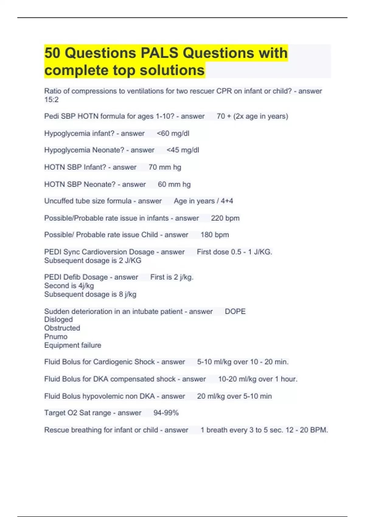 50 Questions PALS Questions with complete top solutions Ratio of compressions to ventilations for two rescuer CPR on infant or child? 15:2 Pedi SBP HOTN formula for ages 1-10? 70 + (2x age in years) Hypoglycemia infant? 60 mg/dl Hypoglycemia Neonate? 45 mg/dl HOTN SBP Infant? 70 mm hg HOTN SBP Neonate? 60 mm hg Uncuffed tube size formula Age in years / 4+4 Possible/Probable rate issue in infants 220 bpm Possible/ Probable rate issue Child 180 bpm PEDI Sync Cardioversion Dosage First dose 0.5 - 1 J/KG. Subsequent dosage is 2 J/KG PEDI Defib Dosage First is 2 j/kg. Second is 4j/kg Subsequent dosage is 8 j/kg Sudden deterioration in an intubate patient DOPE Disloged Obstructed Pnumo Equipment failure Fluid Bolus for Cardiogenic Shock 5-10 ml/kg over 10 - 20 min. Fluid Bolus for DKA compensated shock 10-20 ml/kg over 1 hour. Fluid Bolus hypovolemic non DKA 20 ml/kg over 5-10 min Target O2 Sat range 94-99% Rescue breathing for infant or child 1 breath every 3 to 5 sec. 12 - 20 BPM. Pedi EPI dosage in cardiac arrest 0.01 mg/kg EPI 1:10,000 IV IO Hallmark of lower airway obstruction prolonged expiratory phase with wheezes Hallmark of upper airway obstruction inspiratory stridor Amiodarone dose for persistant VF/ pulseless VT 5 mg/kg may repeat up to 2 times Atropine for symptomatic brady 0.02 mg/kg may repeat once in 5 min. Min. Atropine dose 0.1 mg Pedi adenosine doses First dose 0.1 mg/ kg RIVP. Second 0.2 mg/kg RIVP Ratio of compressions to ventilations for neonate Resuscitation 3:1 Neonate rate for assisted ventilations 40-60 bpm tachycardia rule of thumb 150 -(5 x age in years) max single dose atropine for bradycardia .5 mg Lidocaine dose for refractory VF or PVT 1 mg/kg EPI dose for anaphylaxis .01 mg/kg 1:1000 every 15 min PRN ( Max dose .3 mg) autoinjector EPI dose for PEDI greater than to 30 kg 0.3 mg 1:1000 autoinjector EPI dose for PEDI 10-30 kg 0.15 mg 1:1000 Depth of Compressions at least one third the depth of the chest PEDI dextrose D50W dose? 1-2 ml/kg Infant dextrose D25W dose ? 2-ml/ kg Neonatal Dextrose D10W dose? 5-10 ml/kg Max concentration of dextrose for neonates? D12.5W (0.125 g/ml) Ratio of compressions to ventilations, two rescuer CPR for infants or children? 15:2 Is it permissible to use an adult AED pads on an infant? YES Is it permissible to use PEDI AED pads on an Adult? NO Alone with unwitnessed child or infant arrest? 2 min of CPR before anything else 5 cycles 60 or less? better compress Estimated weight based on age? 1 year = 10 kg 3 years = 15 kg 5 years = 20 kg 7 years = 25 kg 9 years= 30 kg