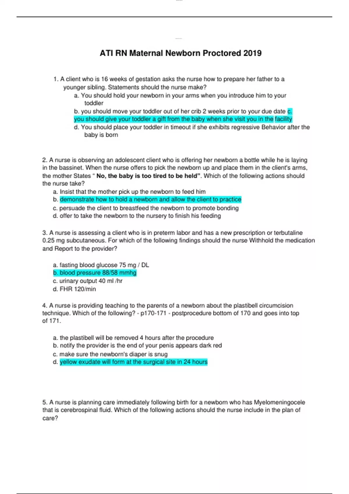1. A client who is 16 weeks of gestation asks the nurse how to prepare her father to a younger sibling. Statements should the nurse make? a. You should hold your newborn in your arms when you introduce him to your toddler b. you should move your toddler out of her crib 2 weeks prior to your due date c. you should give your toddler a gift from the baby when she visit you in the facility d. You should place your toddler in timeout if she exhibits regressive Behavior after the baby is born 2. A nurse is observing an adolescent client who is offering her newborn a bottle while he is laying in the bassinet. When the nurse offers to pick the newborn up and place them in the client's arms, the mother States “ No, the baby is too tired to be held”. Which of the following actions should the nurse take? a. Insist that the mother pick up the newborn to feed him b. demonstrate how to hold a newborn and allow the client to practice c. persuade the client to breastfeed the newborn to promote bonding d. offer to take the newborn to the nursery to finish his feeding 3. A nurse is assessing a client who is in preterm labor and has a new prescription or terbutaline 0.25 mg subcutaneous. For which of the following findings should the nurse Withhold the medication and Report to the provider? a. fasting blood glucose 75 mg / DL b. blood pressure 88/58 mmhg c. urinary output 40 ml /hr d. FHR 120/min 4. A nurse is providing teaching to the parents of a newborn about the plastibell circumcision technique. Which of the following? - p170-171 - postprocedure bottom of 170 and goes into top of 171. a. the plastibell will be removed 4 hours after the procedure b. notify the provider is the end of your penis appears dark red c. make sure the newborn's diaper is snug d. yellow exudate will form at the surgical site in 24 hours 5. A nurse is planning care immediately following birth for a newborn who has Myelomeningocele that is cerebrospinal fluid. Which of the following actions should the nurse include in the plan of care? a. Administer broad-spectrum antibiotics b. cleanse the site with Povidone iodine c. monitor the rectal temperature every 4 hours d. prepare for surgical closure after 72 hours 6. A nurse is caring for a newborn Boys 6 hours old and has a bedside glucose meter reading of 65 mg / DL. The New Orleans mother has Type 2 diabetes mellitus. Which of the following actions should the nurse take? a. Administer 50 mL of dextrose solution IV b. obtain a blood sample of serum glucose level c. reassess the blood glucose level prior to the next feeding d. Feed the newborn immediately 7. A nurse is caring for four enter-partum clients. Which of the following clients should the nurse assess first? a. A client who is at 7 weeks of gestation and reports urinary frequency b. a client who is at 32 weeks of gestation and reports seeing floating spots c. a client who is 38 weeks of gestation and reports leg cramps d. a client who is at 20 weeks of gestation and reports periodic numbness in her fingers 8. A nurse is planning care for a client who is pregnant and has HIV. Which of the following actions Should the nurse include in the plan of care? a. Use a fetal scalp electrode during labor and delivery b. Bathe the newborn before initiating skin to skin contact c. instruct the client to stop taking the antiretroviral medication at 32 weeks of gestation d. administer pneumococcal immunization to the newborn within 4 hours following birth 9. A nurse is caring for a client who has placenta previa. Which of the following findings should the nurse expect? a. Firm rigid abdomen b. painless, vaginal bleeding c. uterine hypertonicity d. persistent headache 10. A nurse is planning care for a newborn who is scheduled to start phototherapy using a lap. Which of the following actions should the nurse include? a. Apply a thin layer lotion to the newborn skin every 8 hours b. trust in you born in a thin layer clothing during the therapy c. ensure the newborn's eyes are closed beneath the shield d. give the newborn 1 oz of glucose water every 4 hours 11. A nurse is providing discharge instructions to a client who is breastfeeding her newborn. Which of the following instructions should the nurse include? a. Expect 2 to 4 wet diapers every 24 hours b. allow the baby to feed at least every 3 hours c. offer the newborn 30 ml (1 oz.) a water between feedings d. feed the newborn 5 to 10 minutes per breast 12. A nurse is assessing a client during her first prenatal visit the client reports March 20th us her last menstrual.. Use Niagele’s rule to calculate the estimated date of delivery. Use the mmdd format with four numerals and no spaces or punctuation. 03/20 → 12/27 12/27 13. A nurse is caring for a client who is at 30 weeks of gestation. The nurse should plan to immunize the client which of the following vaccinations? Select all the apply a. Varicella b. human papillomavirus c. Diphtheria - acellular pertussis d. inactivated influenza e. measles, mumps, and rubella 14. A nurse is caring for a client who has preterm labor and receiving magnesium sulfate by continuous IV infusion. Which of the following laboratory values should the nurse review during tocolytic therapy? a. indirect Coombs test b. liver enzymes c. uric acid level d. Serum medication level 15. A nurse is caring for a client who reports spontaneous rupture. The nurse observed fetal bradycardia in the FHR tracing and notices the umbilical cord is protruding. After calling for assistance and notifying the provider, which of the following should the nurse take next? a. Initiate an infusion of IV fluids for the client b. Perform vaginal examination by applying upward pressure on the presenting part d. Administer oxygen via non rebreather mask at 8L/ min. D. Cover the umbilical cord with sterile saline saturated towel.