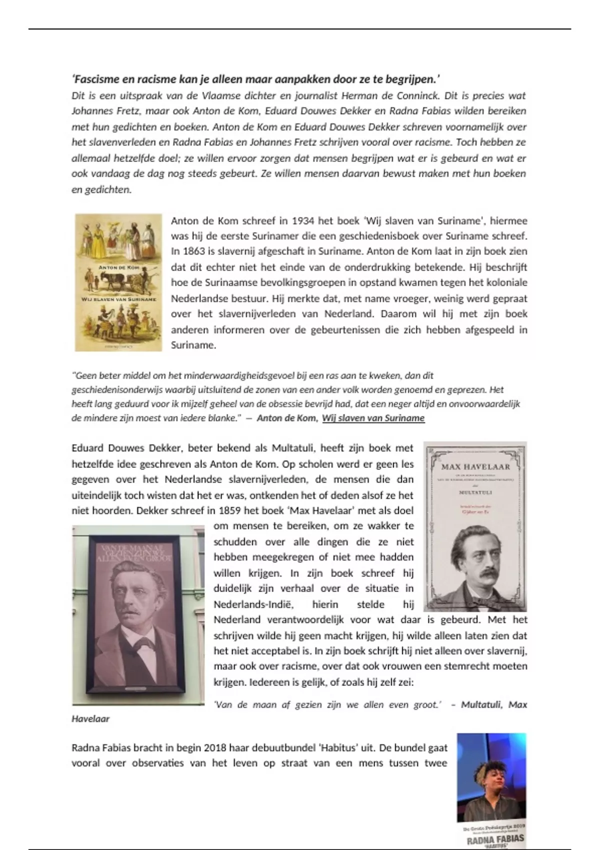 Voor Nederlands kreeg ik in V5 de opdracht met het thema racisme. Ik moest verschillende boeken, werken en gedichten lezen en deze combineren om zo de overeenkomsten in boeken te beschrijven op het gebied van racisme. Voor deze opdracht heb ik gelezen: - Onder de paramariboom - Johan Fretz - Habitus - Radna Fabias - Max Havelaar - Multatuli - Wij slaven van Suriname - Anton de Kom Ik heb in het geschreven stuk meerdere keren gebruik gemaakt van citaten uit de boeken en gedichten. Daarnaast bevat het een bronnenlijst in APA-stijl. Ik kan mij voorstellen dat niet veel mensen eenzelfde opdracht hebben/krijgen, ik denk wel dat dit document nuttig kan zijn om meer van het doel en de achtergrond van de werken te weten te komen, en daarnaast zijn citaten uit een boek altijd handig als je het niet hebt gelezen.