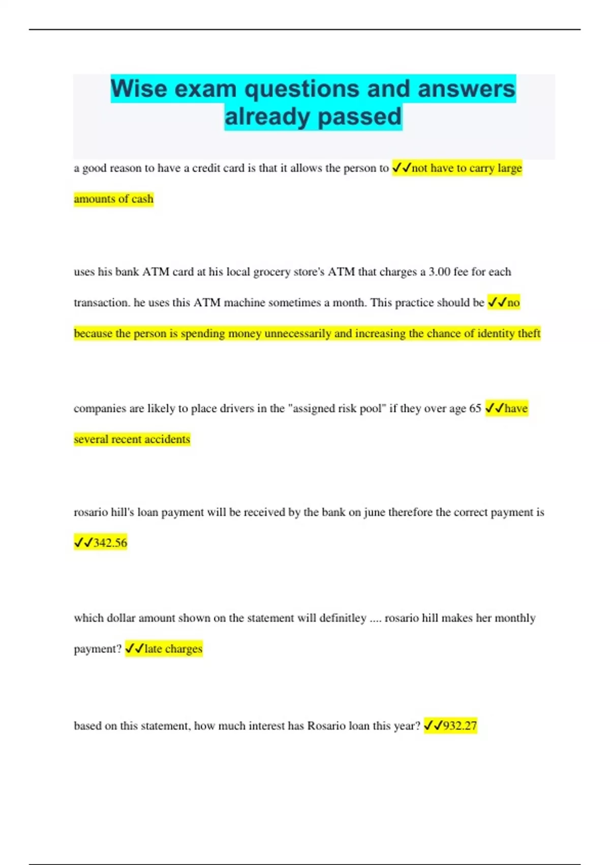 Wise exam questions and answers already passed a good reason to have a credit card is that it allows the person to not have to carry large amounts of cash uses his bank ATM card at his local grocery store's ATM that charges a 3.00 fee for each transaction. he uses this ATM machine sometimes a month. This practice should be no because the person is spending money unnecessarily and increasing the chance of identity theft companies are likely to place drivers in the "assigned risk pool" if they over age 65 have several recent accidents rosario hill's loan payment will be received by the bank on june therefore the correct payment is 342.56 which dollar amount shown on the statement will definitley .... rosario hill makes her monthly payment? late charges based on this statement, how much interest has Rosario loan this year? 932.27 This girl saw an error when reviewing her credit report. What should she do? send the error to her creditors identity theft a person should not provide his social security number over the phone unless the call to the organization where he has an account how can a person improve their credit score pay the amount he owes on his credit cards uses a debit card to make a purchase, the amount of the purchase is from the person's bank account balance at the time of the sale been contributing regularly to her company's 401k plan . she decides to leave the company. it would be financially advisable. the money from the 401k plan and use it as an emergency fund applying for a 20 year old bank mortgage in order to purchase a house. When will this person become the sole owner of the home. the mortgage payments have been made individuals and corporations contribute so generously to charitable organizations? charitable organizations raise credit scores for owning rather then renting a home is that owning a home usually tax deductions and builds financial equity shares of stock at 10$ a share for a total of 400$. she sells the 40 shares at 20$ a share for a total of $800. of 400$ a bank savings account is that it to earn interest while establishing a personal finance history certificate of deposit with a guaranteed rate of interest and a maturity date cost take a summer vacation rather than work over the summer. the money lost by not working is called: financial planner to achieve financial goals to deposit a check a signature is required in the back of a check to pay his monthly telephone bill automatically from his checking account what should this person do this month? money in his checking account to pay the bill the purpose of buying insurance is to financial protection in case of a loss of having pay directly deposited in an employees checking account is that the ....taxes are lower ...cannnot be lost or stolen to cosign a lown for tasha the lender will most likely ramon's creditworthiness for the loan of earning income is 100$ from babysitting houston needs a loan he should first from a well known insurance broker of investments important? the investors risk over several types of investments "paying yourself first" for a person with a part time job is 25$ each week from earnings following information, what are the person's total LIABILITIES mortgage owed, student loan, credit card debt, employees must have money deducted from their paychecks for ....income tax buying insurance for a cell phone is to replace the cell phone if it is lost and stolen can reduce the cost of homeowners insurance by ....an anti theft security system in the house to money management indicates an understanding of the time value of money money in a safe deposit box receives a 200$ gift card it is important for the person to see the condition of the card or packaging to know about the rules for use ...purchasing stock, a person should be aware that their is no guarantee that the price of the stock will go up is inflation, a person can definitely expect rate of unemployment take risk so that their money increased potential for growth Term Life Insurance Policy cash to the insured person when the policy ends Purpose of the Securities Exchange Commission? determine the end of day price of stocks buy collectables such as antiques expecting to have the value of the antiques increase a student is planning to take a student loan from the government payments on most of these loans plan to start blank month the month after the loan is approved a feature of having a fixed interest rate mortgage premiums for homeowners insurance remain the same for the life of the mortgage ..... who wants deposits to be federal deposit insurance corporation insured, should deposit money in a savings account at a credit union which of the following is most liquid savings account at a local bank A form of payment that is guaranteed to be as good as cash is a. personal check