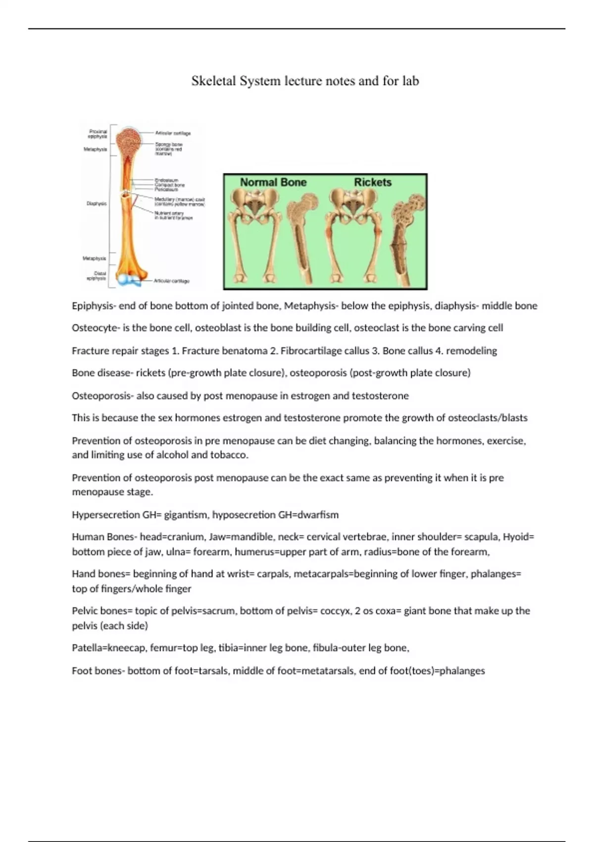 These are notes I took based off the skeletal system lab to help with studying for the exam.
