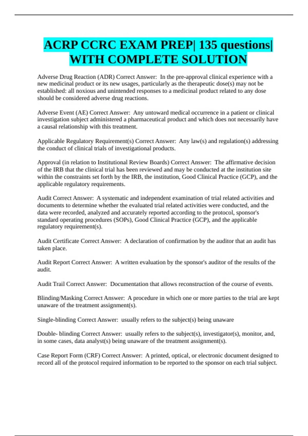 ACRP CCRC EXAM PREP| 135 questions| WITH COMPLETE SOLUTION Adverse Drug Reaction (ADR) Correct Answer: In the pre-approval clinical experience with a new medicinal product or its new usages, particularly as the therapeutic dose(s) may not be established: all noxious and unintended responses to a medicinal product related to any dose should be considered adverse drug reactions. Adverse Event (AE) Correct Answer: Any untoward medical occurrence in a patient or clinical investigation subject administered a pharmaceutical product and which does not necessarily have a causal relationship with this treatment. Applicable Regulatory Requirement(s) Correct Answer: Any law(s) and regulation(s) addressing the conduct of clinical trials of investigational products. Approval (in relation to Institutional Review Boards) Correct Answer: The affirmative decision of the IRB that the clinical trial has been reviewed and may be conducted at the institution site within the constraints set forth by the IRB, the institution, Good Clinical Practice (GCP), and the applicable regulatory requirements. Audit Correct Answer: A systematic and independent examination of trial related activities and documents to determine whether the evaluated trial related activities were conducted, and the data were recorded, analyzed and accurately reported according to the protocol, sponsor's standard operating procedures (SOPs), Good Clinical Practice (GCP), and the applicable regulatory requirement(s). Audit Certificate Correct Answer: A declaration of confirmation by the auditor that an audit has taken place. Audit Report Correct Answer: A written evaluation by the sponsor's auditor of the results of the audit. Audit Trail Correct Answer: Documentation that allows reconstruction of the course of events. Blinding/Masking Correct Answer: A procedure in which one or more parties to the trial are kept unaware of the treatment assignment(s). Single-blinding Correct Answer: usually refers to the subject(s) being unaware Double- blinding Correct Answer: usually refers to the subject(s), investigator(s), monitor, and, in some cases, data analyst(s) being unaware of the treatment assignment(s). Case Report Form (CRF) Correct Answer: A printed, optical, or electronic document designed to record all of the protocol required information to be reported to the sponsor on each trial subject.