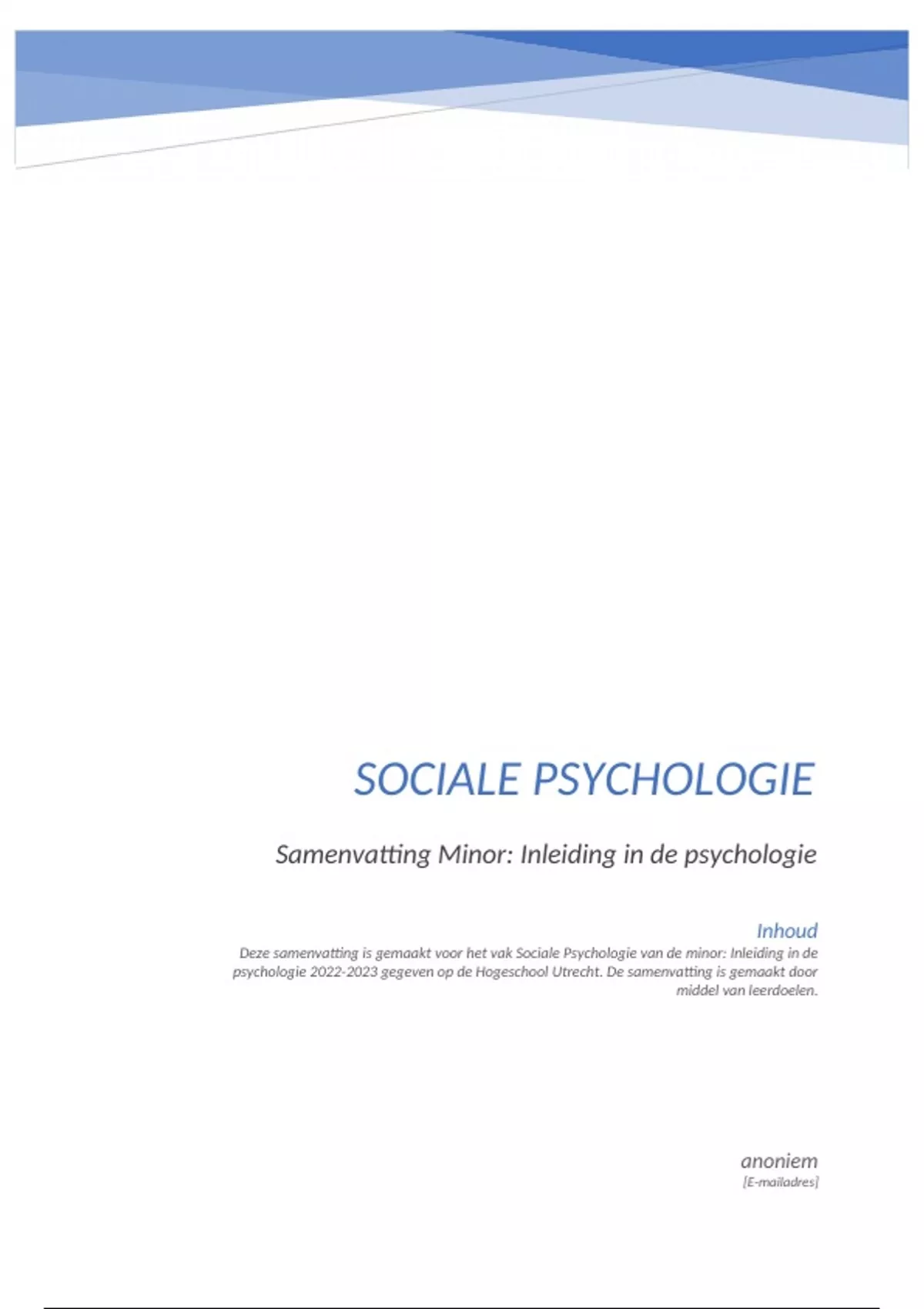 Deze samenvatting is gemaakt voor het vak Sociale Psychologie van de minor: Inleiding in de