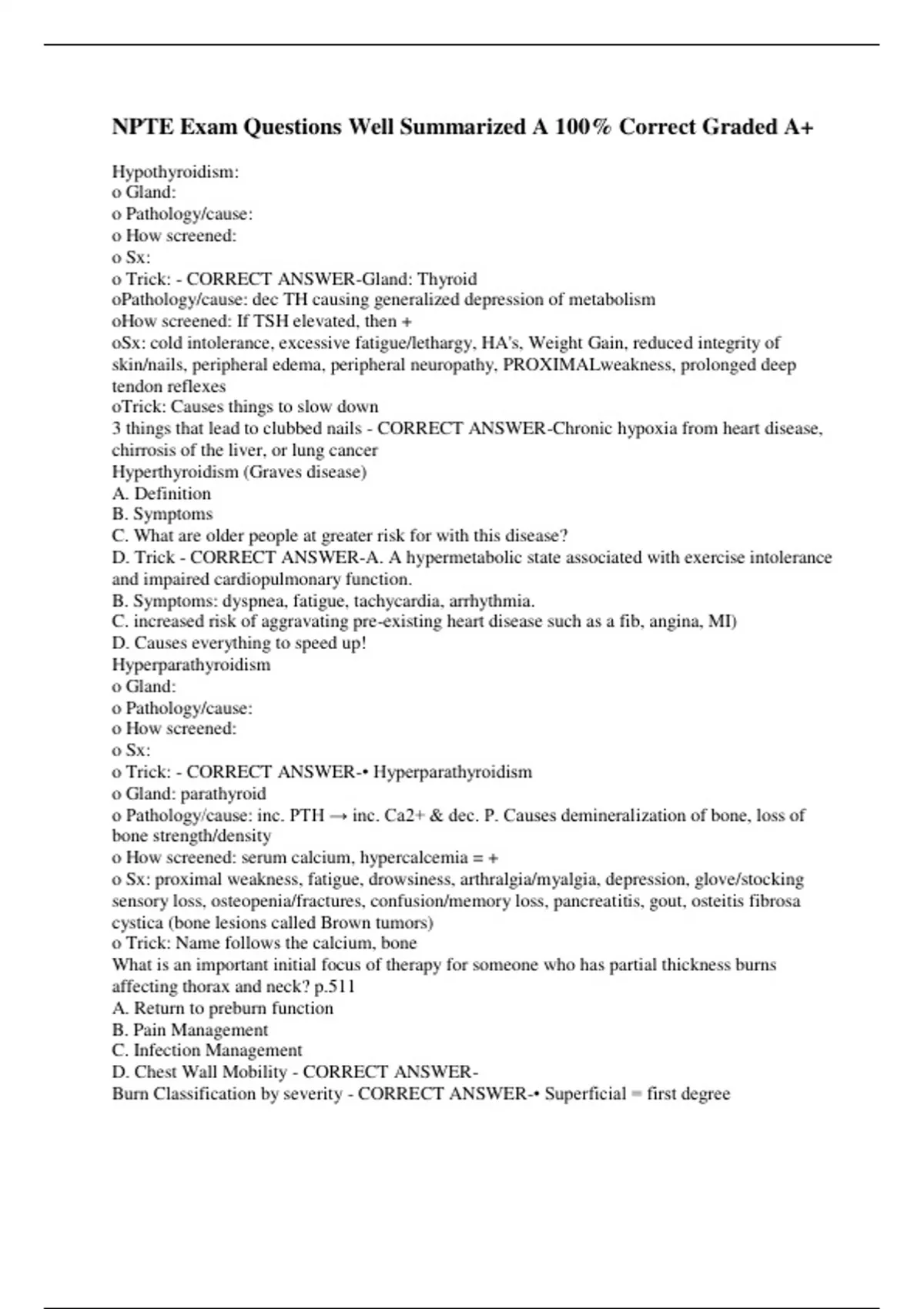 NPTE Exam Questions Well Summarized A 100% Correct Graded A+ Hypothyroidism: o Gland: o Pathology/cause: o How screened: o Sx: o Trick: - CORRECT ANSWER-Gland: Thyroid oPathology/cause: dec TH causing generalized depression of metabolism oHow screened: If TSH elevated, then + oSx: cold intolerance, excessive fatigue/lethargy, HA's, Weight Gain, reduced integrity of skin/nails, peripheral edema, peripheral neuropathy, PROXIMALweakness, prolonged deep tendon reflexes oTrick: Causes things to slow down 3 things that lead to clubbed nails - CORRECT ANSWER-Chronic hypoxia from heart disease, chirrosis of the liver, or lung cancer Hyperthyroidism (Graves disease) A. Definition B. Symptoms C. What are older people at greater risk for with this disease? D. Trick - CORRECT ANSWER-A. A hypermetabolic state associated with exercise intolerance and impaired cardiopulmonary function. B. Symptoms: dyspnea, fatigue, tachycardia, arrhythmia. C. increased risk of aggravating pre-existing heart disease such as a fib, angina, MI) D. Causes everything to speed up! Hyperparathyroidism o Gland: o Pathology/cause: o How screened: o Sx: o Trick: - CORRECT ANSWER-• Hyperparathyroidism o Gland: parathyroid o Pathology/cause: inc. PTH → inc. Ca2+ & dec. P. Causes demineralization of bone, loss of bone strength/density o How screened: serum calcium, hypercalcemia = + o Sx: proximal weakness, fatigue, drowsiness, arthralgia/myalgia, depression, glove/stocking sensory loss, osteopenia/fractures, confusion/memory loss, pancreatitis, gout, osteitis fibrosa cystica (bone lesions called Brown tumors) o Trick: Name follows the calcium, bone What is an important initial focus of therapy for someone who has partial thickness burns affecting thorax and neck? p.511 A. Return to preburn function B. Pain Management C. Infection Management D. Chest Wall Mobility - CORRECT ANSWER- Burn Classification by severity - CORRECT ANSWER-• Superficial = first degree • Subnburn; 2-5 days healing • Superficial partial-thickness = second degree • Deep partial-thickness = second degree • 3-5 weeks; blistering, keloid formation • Full-Thickness = third degree • Complete destruction of epidermis, dermis, subcutaneous tissues like fat and some muscle damage • Subdermal = Fourth degree • Involves bone and muscle • Destruction of vascular system = more tissue necrosis • Electrical burn or prolonged burn o Amputation/muscle paralysis common What are the most important muscle for walking? A. Upper Trap, rhomboids, lev scap B. Deltoid, coracobrachialis, brachialis C. Middle Trap, Ser Ant, triceps D. Lower Trap, Lat dorsi, pec major - CORRECT ANSWER-D. Because shoulder depressors, extensors, and elbow extensors nec for crutch use--other answers involve shoulder elevation, and abduction Lesson: look at other answers and eliminate those muscled which are NOT helpful Which of the following would NOT be an appropriate (contraindiated) AFO for a patient with changing leg volume? which IS appropriate? A. Conventional AFO B. Molded Plastic AFO C. Bichannel adjustable ankle lock (BiCAAL) D. Patella tendon bearing rim AFO - CORRECT ANSWER-B. Molded Plastic AFO (p250 manual) A. accomodates limb volume changes--other ones may as well I'm not sure Scoliosis What angles dictate conservative management/physical therapy exclusively would be best? What angles for braces? What angle is surgery required at? - CORRECT ANSWER-For 25 deg, conservative management; 25-45 deg spinal orthoses/braces?, 45 deg surgery required What level of a SCI might a wrist-driven tenodesis orthosis (flexor-hinge orthosis) be used? Define what it does. What level (nerve root) is active finger flexion? - CORRECT ANSWER-Quadriplegia level C6; uses the wrist extensors to approximate the thumb and forefingers in absence of active finger flexion. Flexor Digitorum is C7-T1 What are the pressure tolerant surfaces of the body are accounted for in the making of a socket for the above knee amputee? - CORRECT ANSWER-ischial tuberosity, and gluteals; also lateral side of the thigh, and kind of to the distal end of the amputation but not so much Airway clearance for CF patient in acute respiratory failure? - CORRECT ANSWER- A. Normal Capillary Refill B. Describe Rubor of Dependency Test C. Ankle Brachial Index Formula D. Protective Sensation: which level of myofilament? - CORRECT ANSWER-A. 3 seconds B. Elevate LE for 1 min, sole of foot goes pale, lower LE to neutral, if adequate arterial circulation the sole of foot should exhibit rubor in 15 sec C. (tibial SBP) / Brachial SBP (normal = 1.0); don't compress .6 or lower D. 5.07 (10g) Semmes-Weinstein monofilaments ABCD's of Melanoma What is a Nevi? - CORRECT ANSWER-Assymetry ( two halves are different) Border (irregular edges) Color: varies throughout mole Diameter: pencil eraser (6mm) - Nevi = Moles, nevus is the singular Stages of Pressure Ulcers - CORRECT ANSWER-Stage I: non-blanchable erythema Stage II: partial thickness skin loss: blister/shallow crater Stage III: FULL thickness skin loss into fat layer, but SUPERFICIAL to fascia Stage IV: full thickness BEYOND fascia and into muscle, maybe even bone Unstageable: obscured by necrotic tissue Anode vs. Cathode: which one is which? - CORRECT ANSWER-Anode: Positive Cathode: Negative A. Risk Factors for Pressure Ulcers Primary Secondary B. What is appropriate relief of pressure areas? - CORRECT ANSWER-A. Primary: immobility Secondary: decreased sensation, moisture, friction/shearing, dec. arterial blood flow, abnormal BMI (high or low) B. 3-4 times per hour in recumbent position, every 15-20 minutes while sitting Treatment for each stage of pressure ulcer - CORRECT ANSWER-Stage I: pressure, friction/moisture relieve maneuvers only; Stage II: dressings AND stage I tx's; Stage III: debridement + stage II; Stage IV: surgery, grafting, + stage III. 2 weeks is when you look to see signs of healing, or else something more may be indicated. A. Usucal location of Arterial Insufficiency 