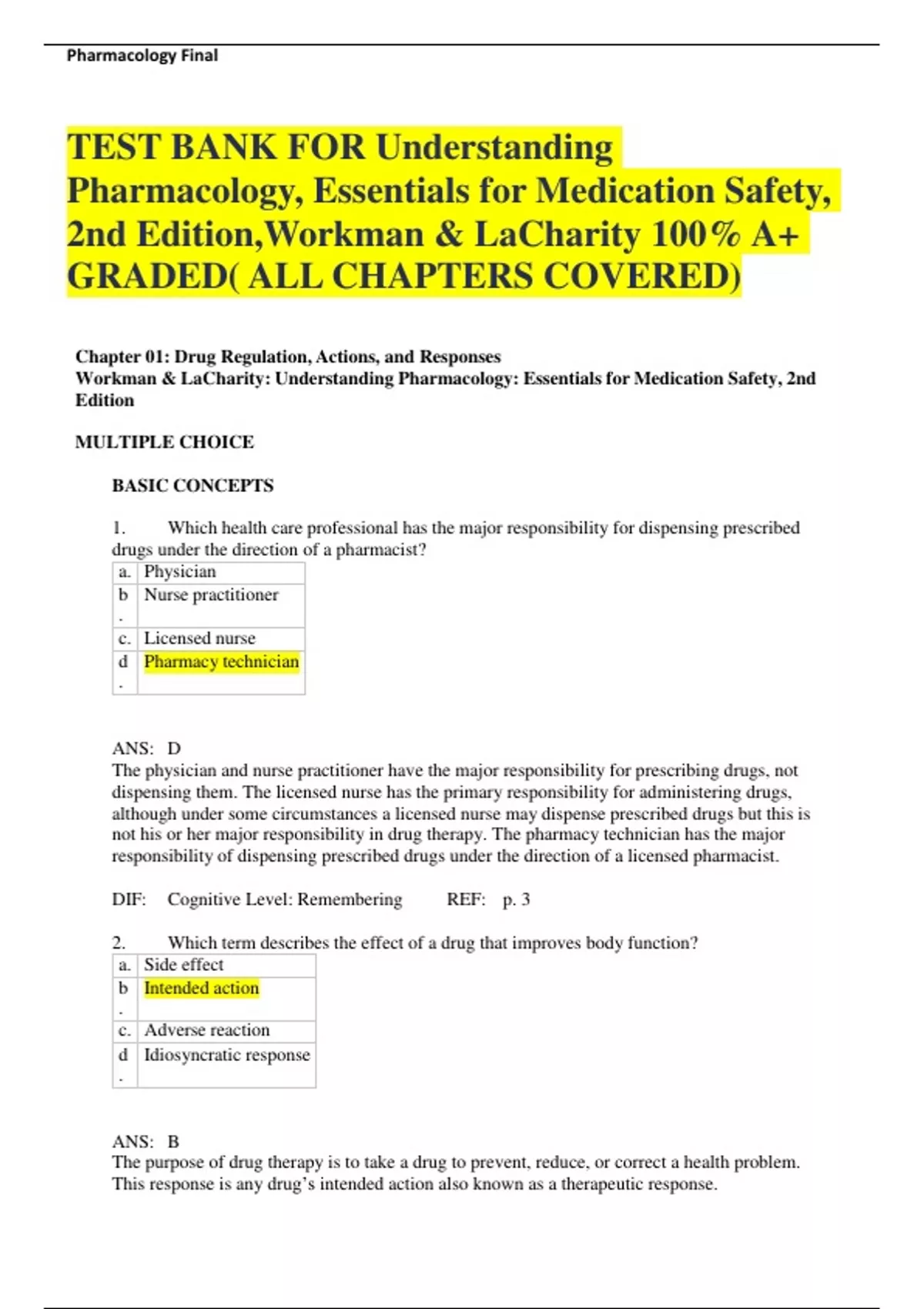 TEST BANK FOR Understanding Pharmacology, Essentials for Medication Safety, 2nd Edition,Workman & LaCharity 100% A+ GRADED( ALL CHAPTERS COVERED)