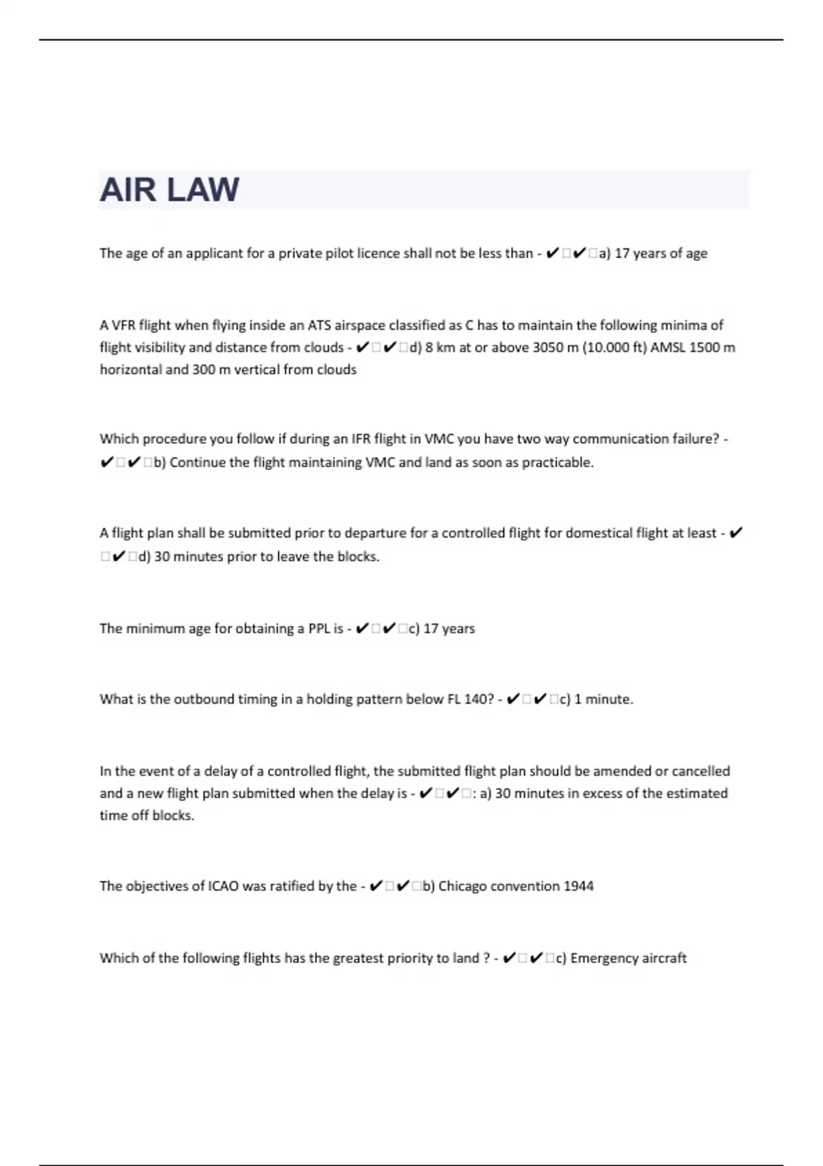 The age of an applicant for a private pilot licence shall not be less than - ️️a) 17 years of age A VFR flight when flying inside an ATS airspace classified as C has to maintain the following minima of flight visibility and distance from clouds - ️️d) 8 km at or above 3050 m (10.000 ft) AMSL 1500 m horizontal and 300 m vertical from clouds Which procedure you follow if during an IFR flight in VMC you have two way communication failure? - ️️b) Continue the flight maintaining VMC and land as soon as practicable. A flight plan shall be submitted prior to departure for a controlled flight for domestical flight at least - ️️d) 30 minutes prior to leave the blocks. The minimum age for obtaining a PPL is - ️️c) 17 years What is the outbound timing in a holding pattern below FL 140? - ️️c) 1 minute. In the event of a delay of a controlled flight, the submitted flight plan should be amended or cancelled and a new flight plan submitted when the delay is - ️️: a) 30 minutes in excess of the estimated time off blocks. The objectives of ICAO was ratified by the - ️️b) Chicago convention 1944 Which of the following flights has the greatest priority to land ? - ️️c) Emergency aircraft