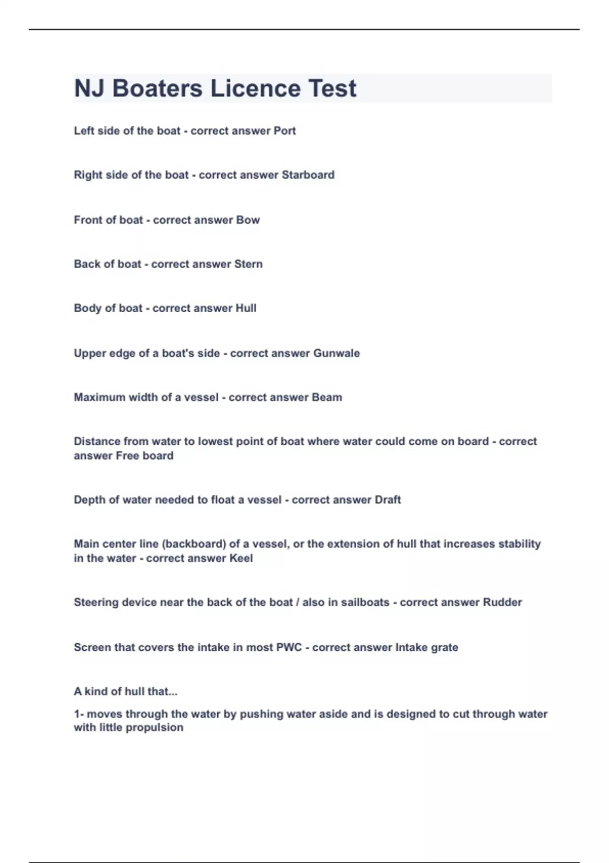 Left side of the boat Port Right side of the boat Starboard Front of boat Bow Back of boat Stern Body of boat Hull Upper edge of a boat's side Gunwale Maximum width of a vessel Beam Distance from water to lowest point of boat where water could come on board Free board Depth of water needed to float a vessel Draft Main center line (backboard) of a vessel, or the extension of hull that increases stability in the water Keel Steering device near the back of the boat / also in sailboats Rudder Screen that covers the intake in most PWC Intake grate A kind of hull that... 1- moves through the water by pushing water aside and is designed to cut through water with little propulsion 2- go generally slower because they have round bottomed-hull shapes 3- more common on large cruisers and sailboats 4- provide a smoother ride Displacement hull The boats ______________ is the amount of water that moves out of the way of the boat when in motion. This weight equals the weight of the boat. Displacement A kind of hull that... 1- Rise up and glide on top of the water 2- have a flat / v shaped bottom 3- faster 4- common on PWC and slower power driven vehicles 5- Drive in 3 different modes Planing hull The 3 different modes of a planing hull are... Displacement, Plowing, Planing The length of the boats hull excluding all attachments and tip of the bow in a straight line to the stern determine the overall boat ______ Length